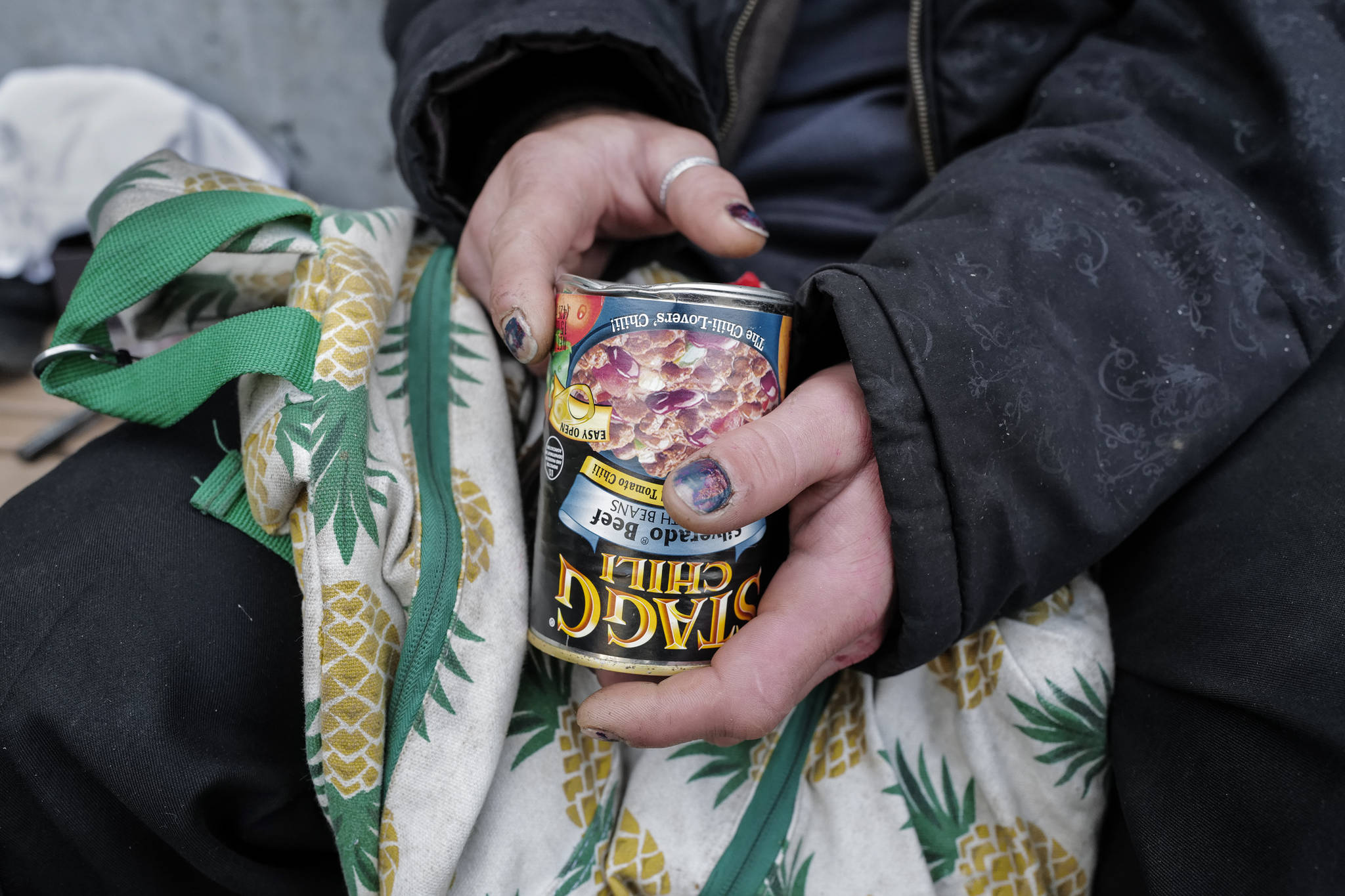 Justin Fairclough, who said he has stayed on and off at the Glory Hall over the last four years, holds a can of chili in front of the Juneau Downtown Library on Tuesday, Aug. 13, 2019. Fairclough said he had no way of heating the food for lunch. (Michael Penn | Juneau Empire)