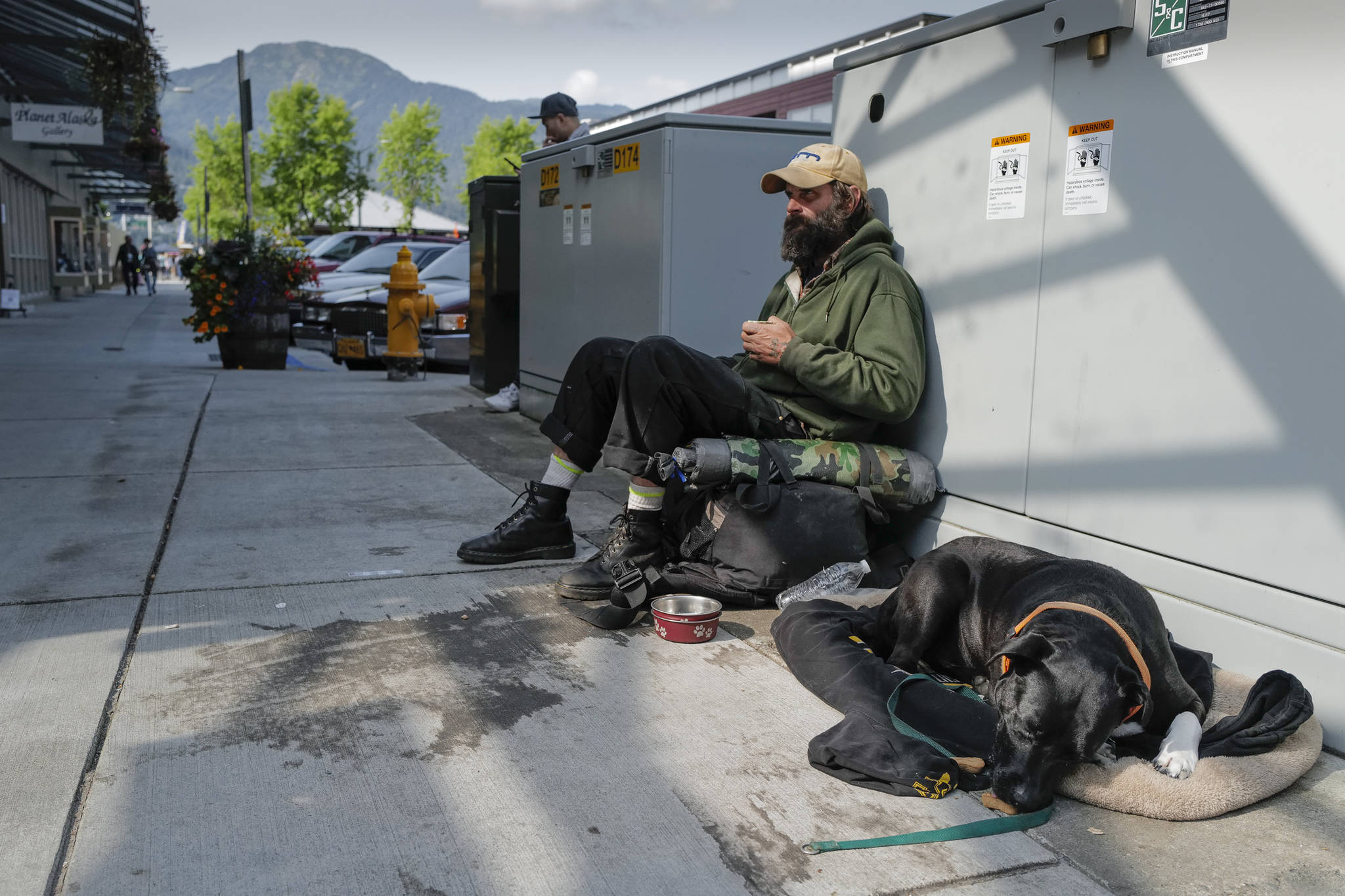 Woody MacAllister hangs out on Franklin Street at Ferry Way with his dog, Rainy, on Tuesday, Aug. 13, 2019. McAllister said he doesn’t stay at the Glory Hall, Juneau’s emergency shelter and soup kitchen, but does eat there. (Michael Penn | Juneau Empire)