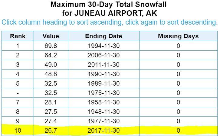 Both marks came courtesy of a flood of Arctic air that poured through the gaps in the coast range after the first week in November. A series of typical fall storms moved over top of that cold air but failed to displace it. That meant all their moisture fell as snow instead of rain in the capital city. The chilly conditions brought unseasonably clear weather as well: Juneau had six days of clear skies in the first half of the month, and another 11 days of partly cloudy weather.