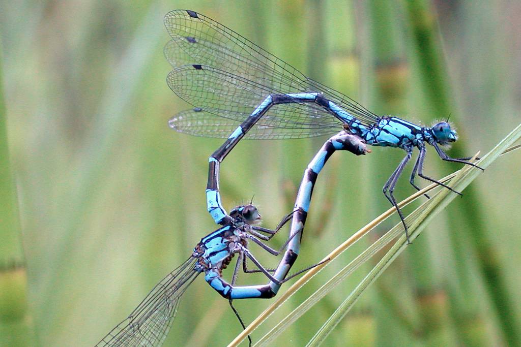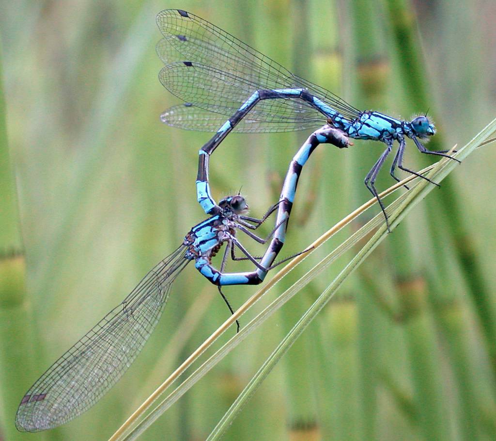 A male bluet damselfly and a willing female form the mating wheel for copulation. (Photo by Bob Armstrong)
