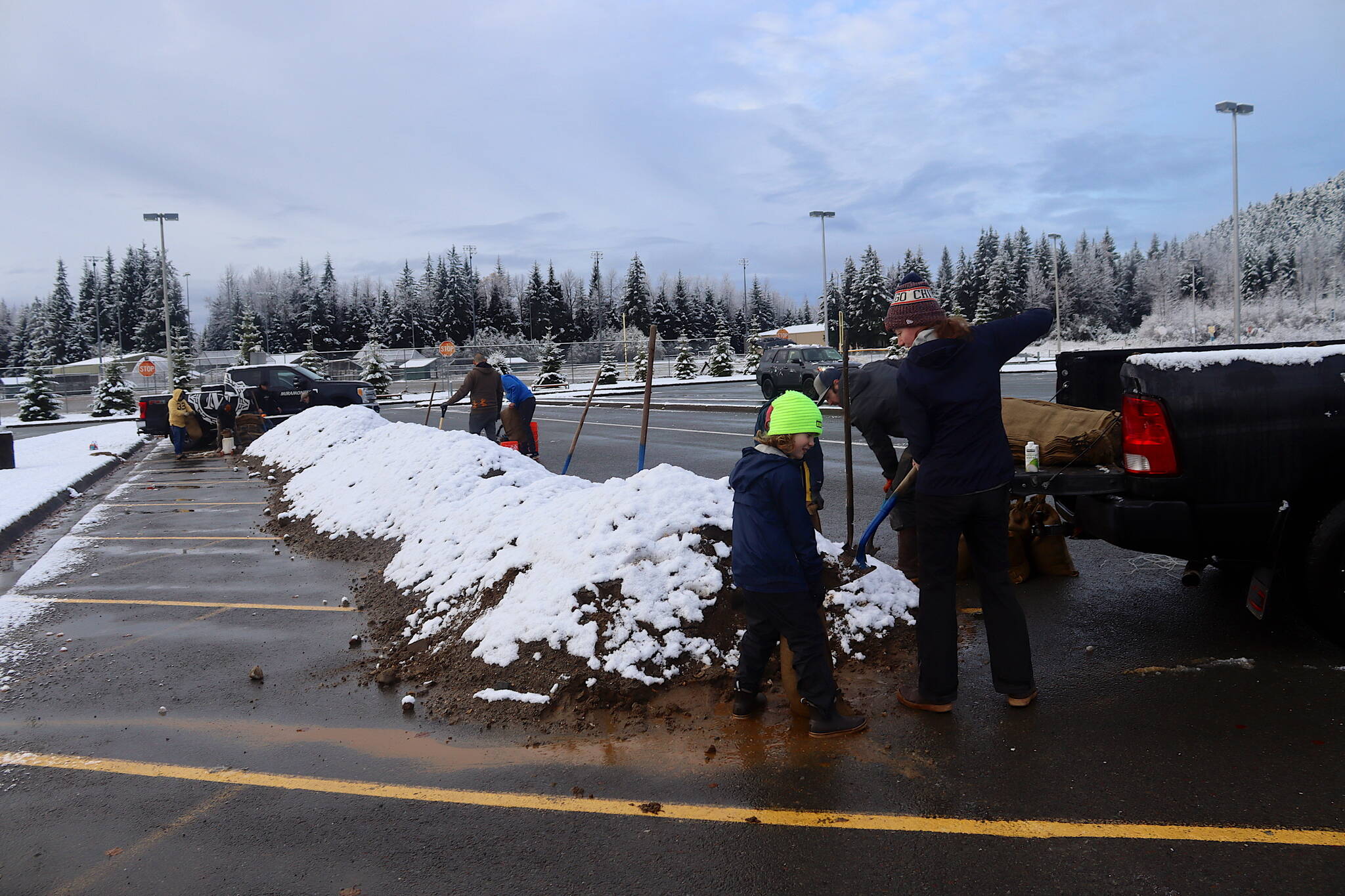 Farley and her husband James were among the many residents in areas affected by the record Aug. 6 Suicide Basin flood who were picking up some of the 75,000 sandbags being distributed free by the city at the Mendenhall Valley Public Library. The couple took the maximum of 200 bags allowed per household and were filling them with sand from a large pile at Melvin Park, one of two spots along with the Thunder Mountain Middle School parking lot where sand was provided.
