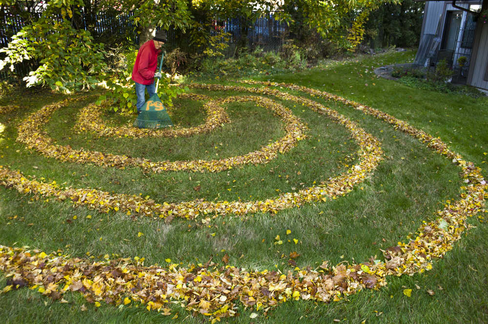 Juneau artist Jay Crondahl adds a little ephemeral art to the lawn at the Park Shore Condominiums on Monday.