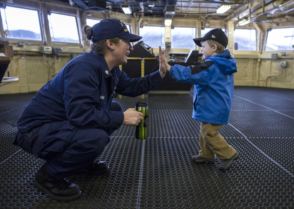 Kirk Thorsteinson holds up his son, Craig, 5, so he can look through the 20-power binoculars on the bridge of the polar icebreaker U.S. Coast Guard Cutter Healy during public tours on Friday. The ship stopped in Juneau during a return trip to its Seattle base after its Arctic West Summer 2015 science mission.