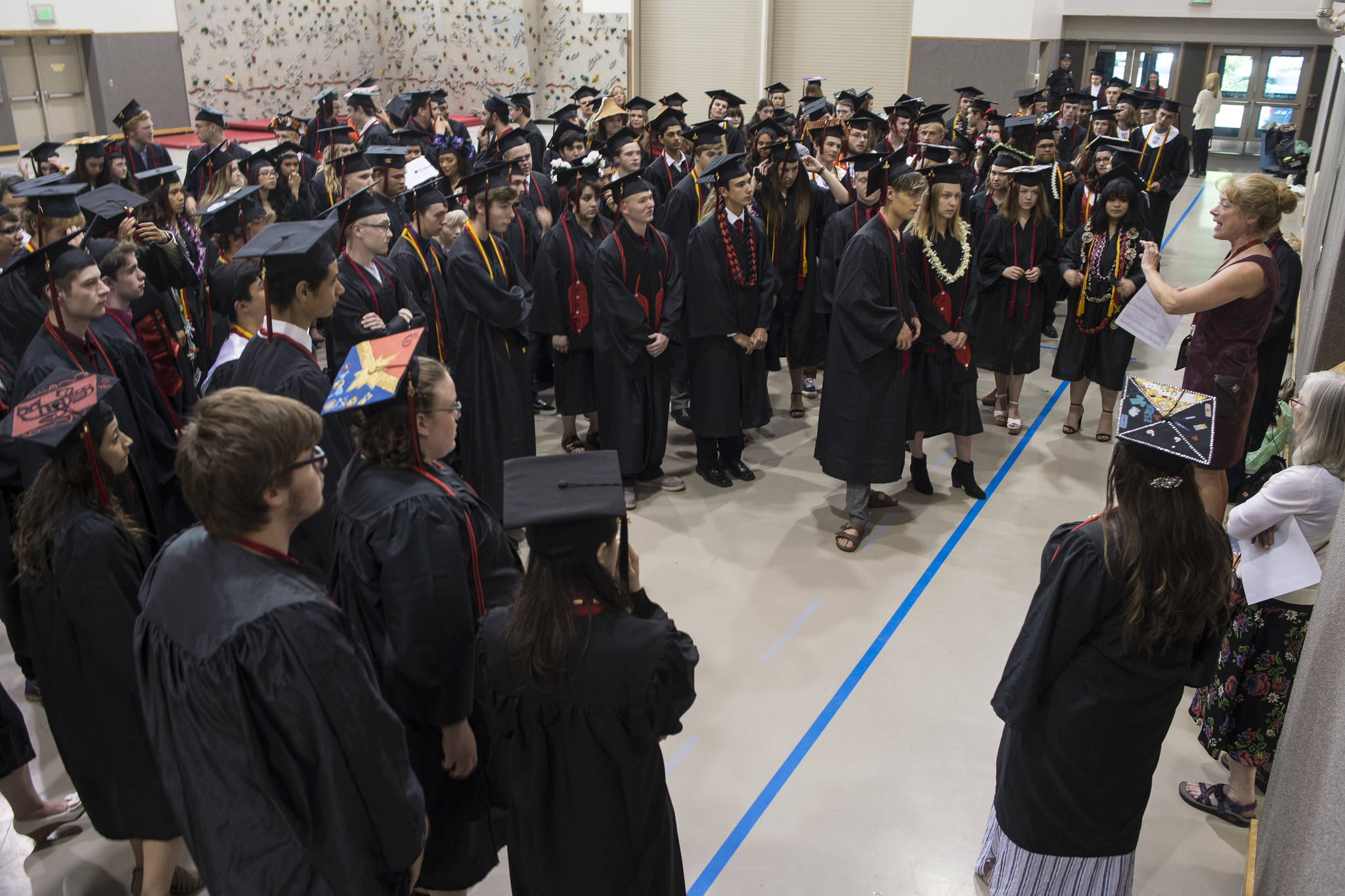Seniors receive last-minute instructions before the Juneau-Douglas High School: Yadaa.at Kalé graduation on Sunday, May 26, 2019. (Michael Penn | Juneau Empire)