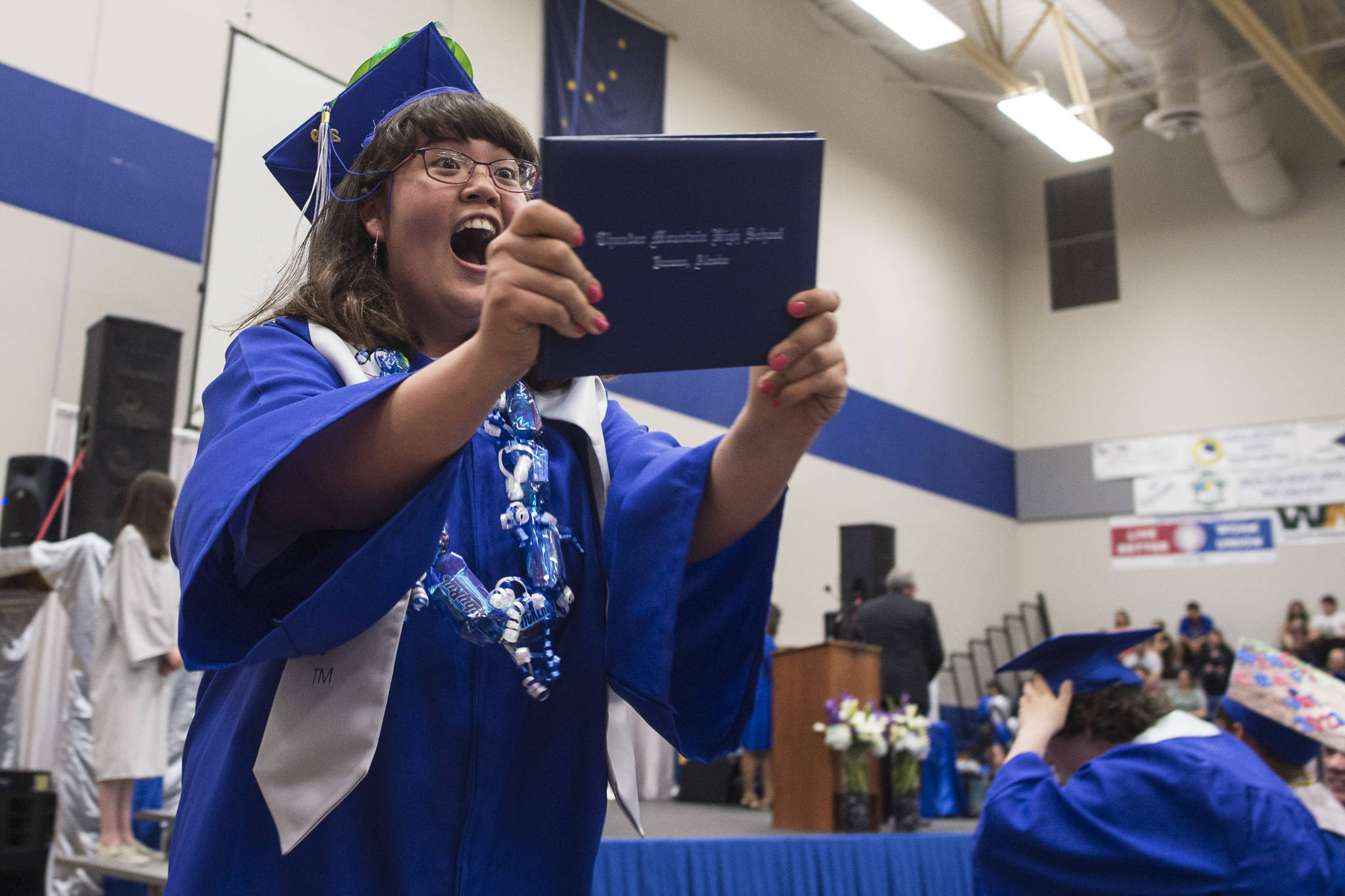 Adindean Franklin displays her diploma for her family after walking off the stage during the Thunder Mountain High School graduation on Sunday, May 26, 2019. (Michael Penn | Juneau Empire)