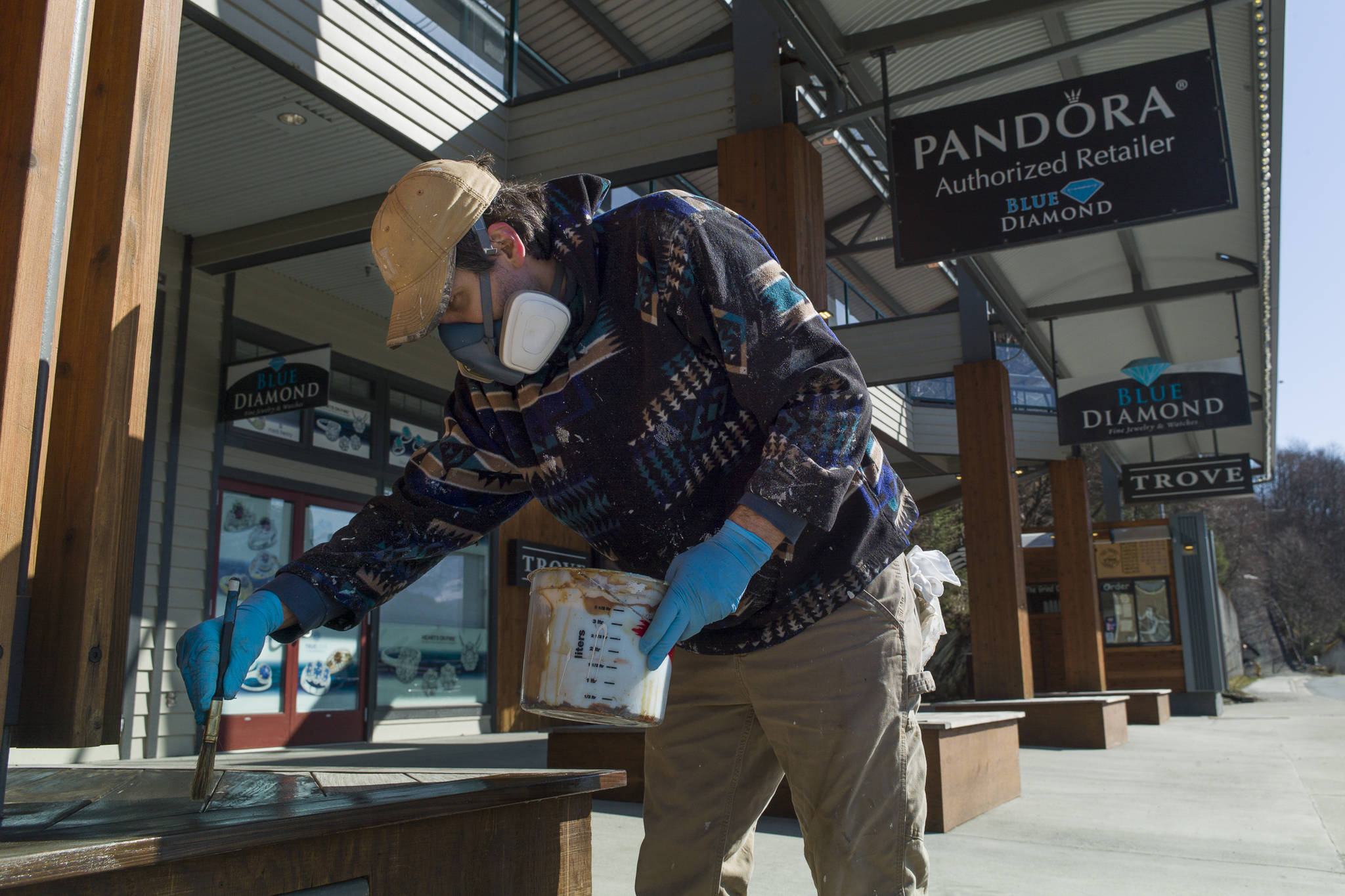 Richard Hotch, of Herr’s Painting, gives benches a sealing coat at the Alaska T-Shirt Mall on Friday, March 29, 2019. (Michael Penn | Juneau Empire)
