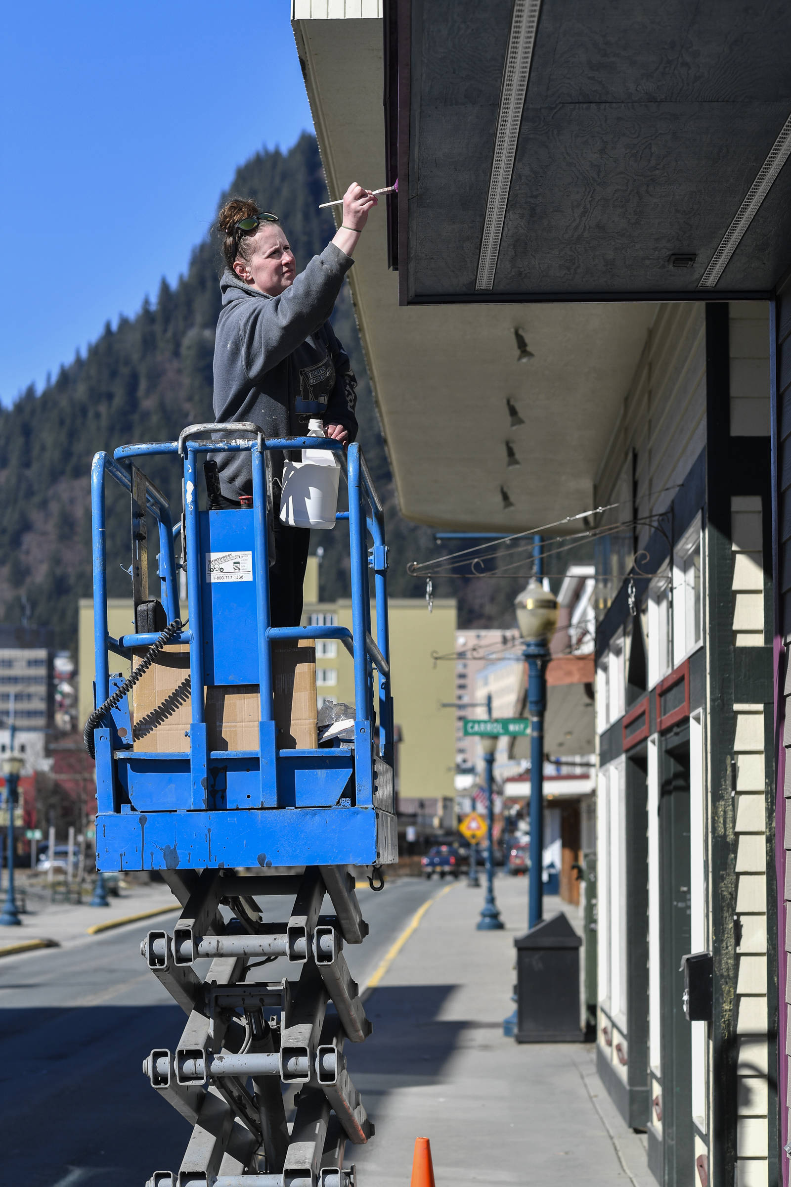 A Herr’s Painting employee hand paints the trim on the front of Tanzanite International on Monday, April 15, 2019. (Michael Penn | Juneau Empire)