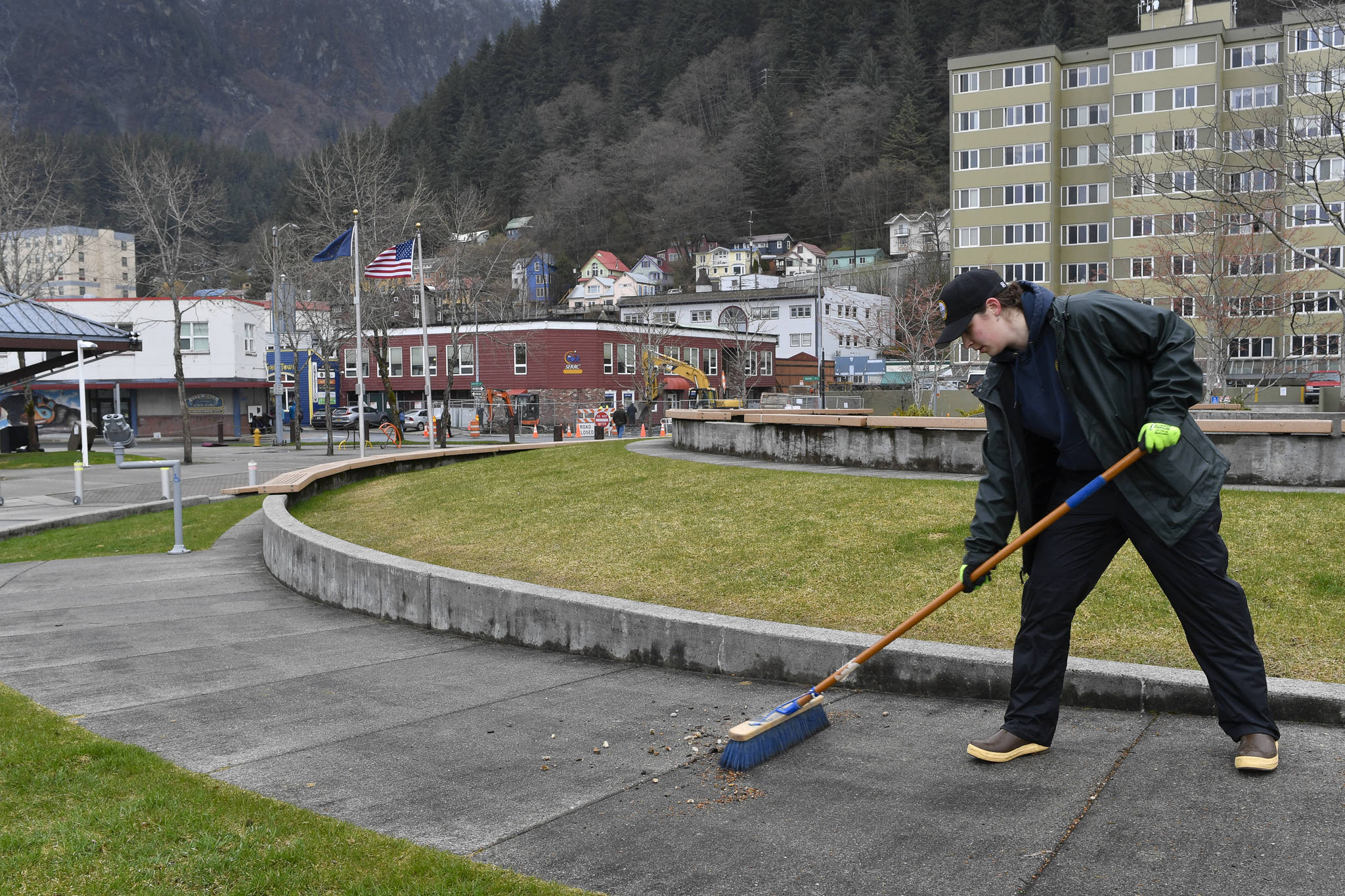 Sarah Mikesell, of the city’s Dock and Harbors department, sweeps the sidewalk at Marine Park on Friday, April 19, 2019. (Michael Penn | Juneau Empire)