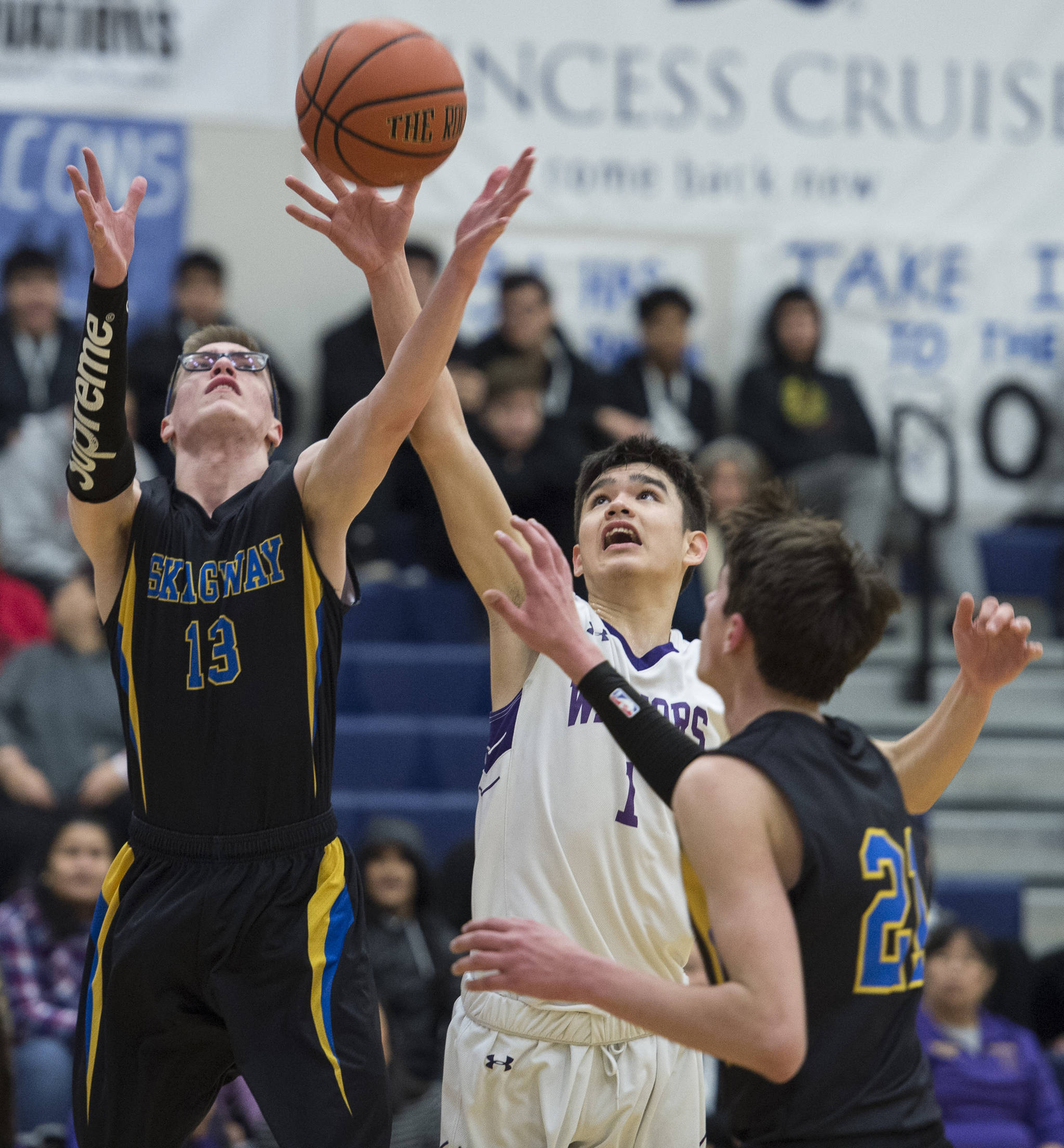 Thorne Bay’s Jacob Congdon shoots over Kake’s Nicholas Davis, left, and Luke Hanson in the final of the Region V 1A Basketball Championships at Thunder Mountain High School on Friday, March 1, 2019. Thorne Bay won 55-44. (Michael Penn | Juneau Empire)