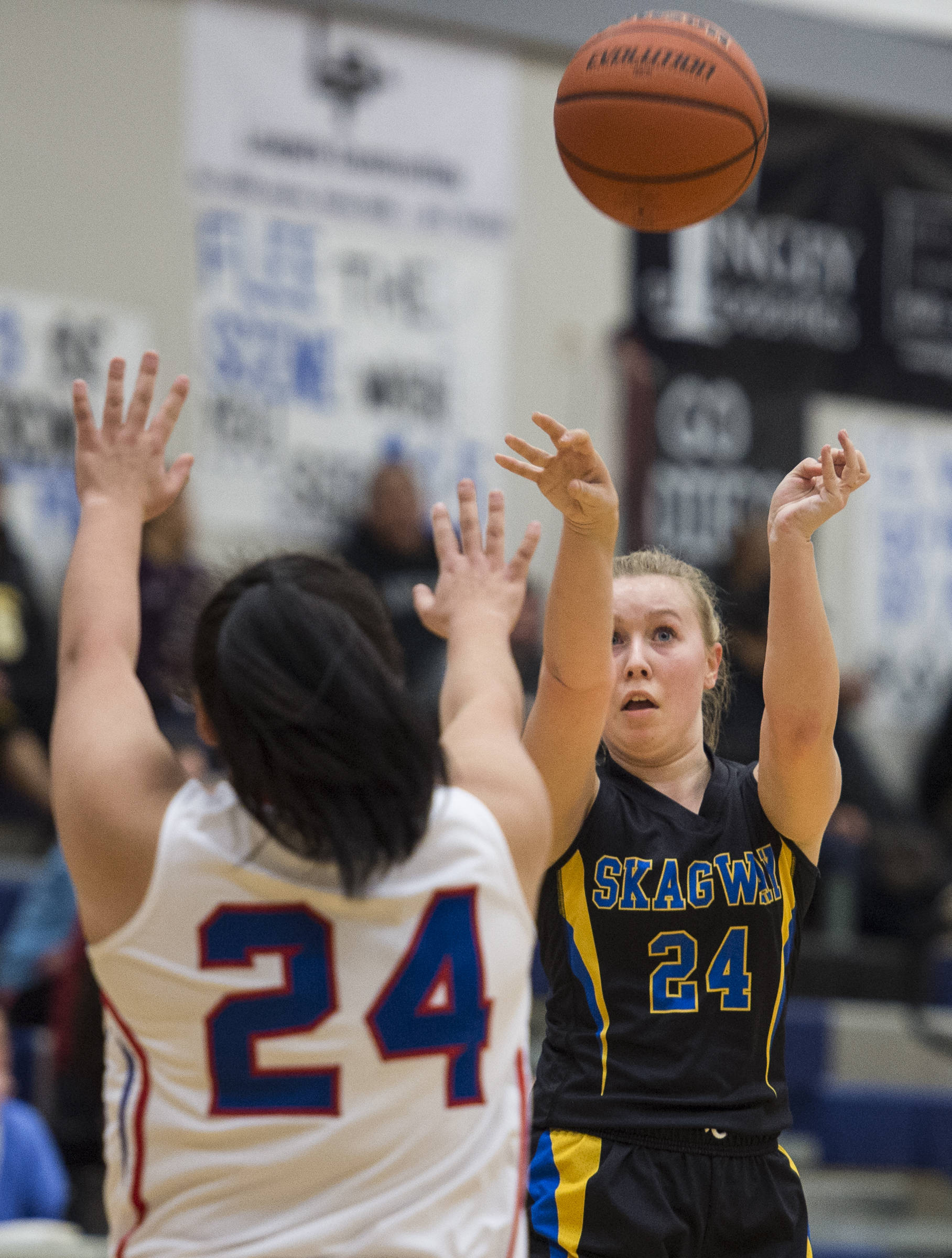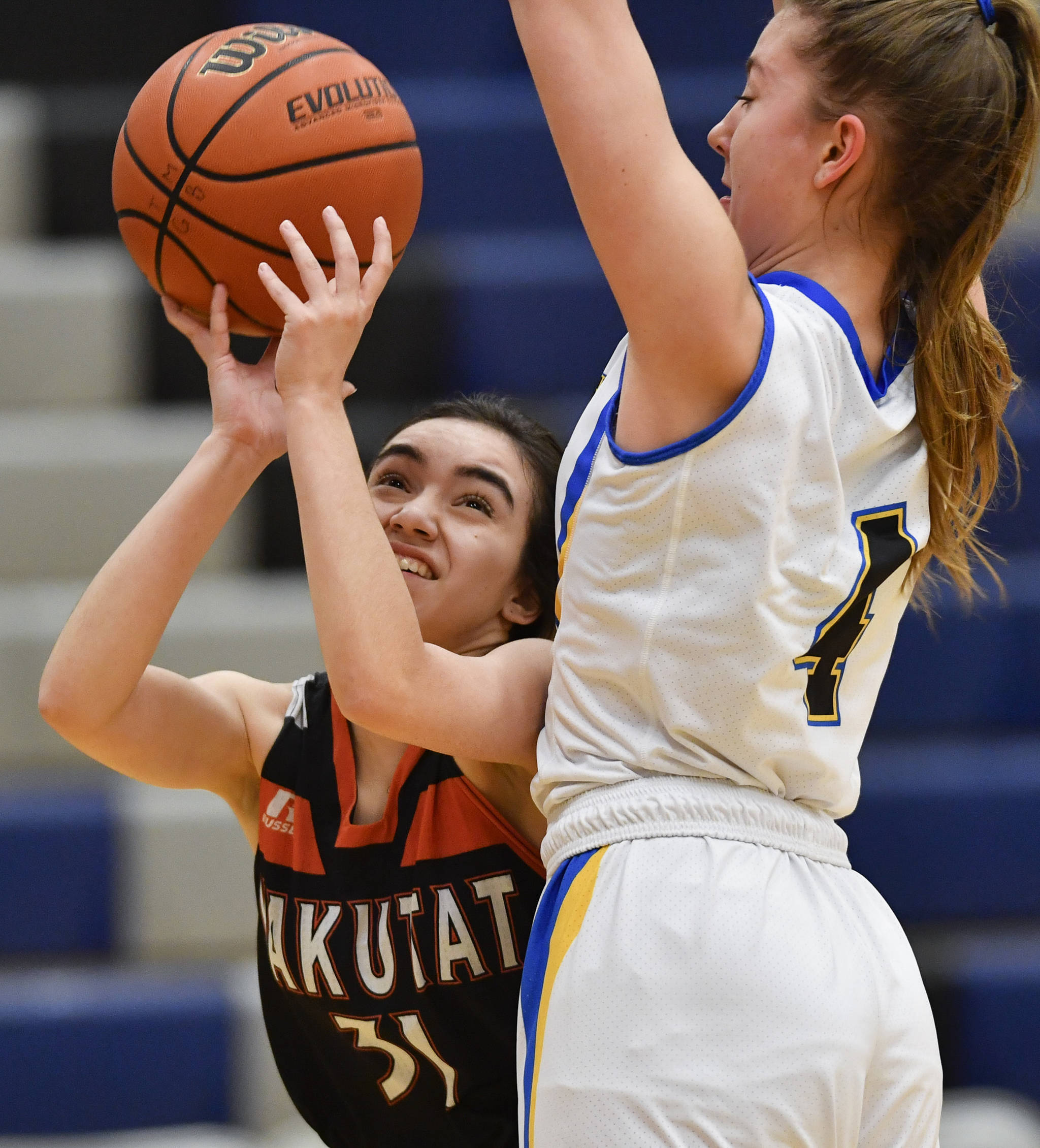 Skagway’s Madison Cox shoots over Kake’s Felicia Ross-Shaquanie at the Region V 1A Basketball Championships at Thunder Mountain High School on Thursday, Feb. 28, 2019. Kake won 43-30. (Michael Penn | Juneau Empire)