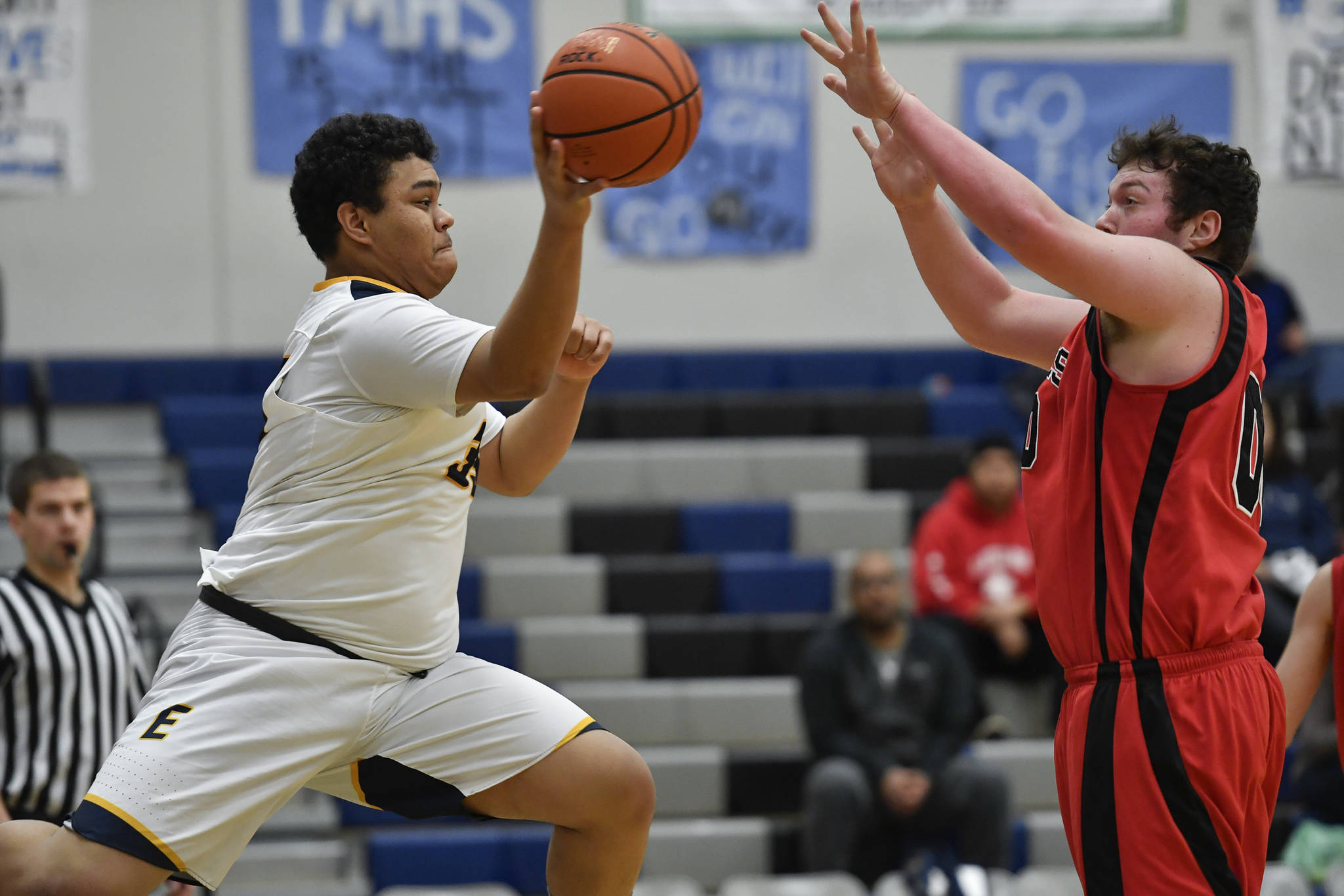 Yakutat’s Jerry Ridington, center, finds himself surrounded by Gustavus’s David Blaine, left, Jacob Patrick, Daniel Bohike and Skyler Glenn Region V 1A Basketball Championships at Thunder Mountain High School on Wednesday, Feb. 27, 2019. Gustavus won 40-39.(Michael Penn | Juneau Empire)