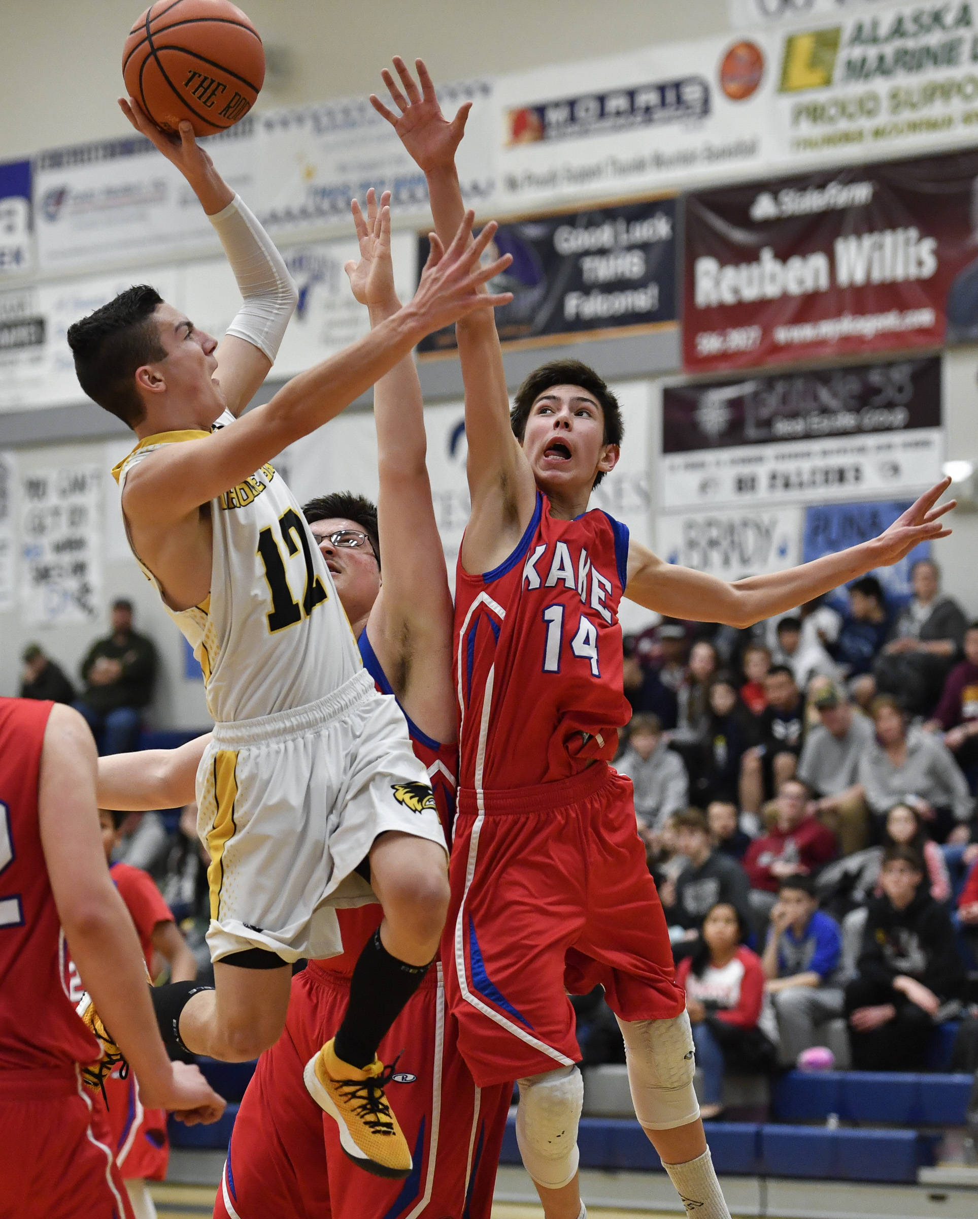 Thorne Bay’s Stockton Schwab, left, shoots against Kake’s Luke Hanson, center, and Shawn Merry in the final of the Region V 1A Basketball Championships at Thunder Mountain High School on Friday, March 1, 2019. Thorne Bay won 55-44. (Michael Penn | Juneau Empire)