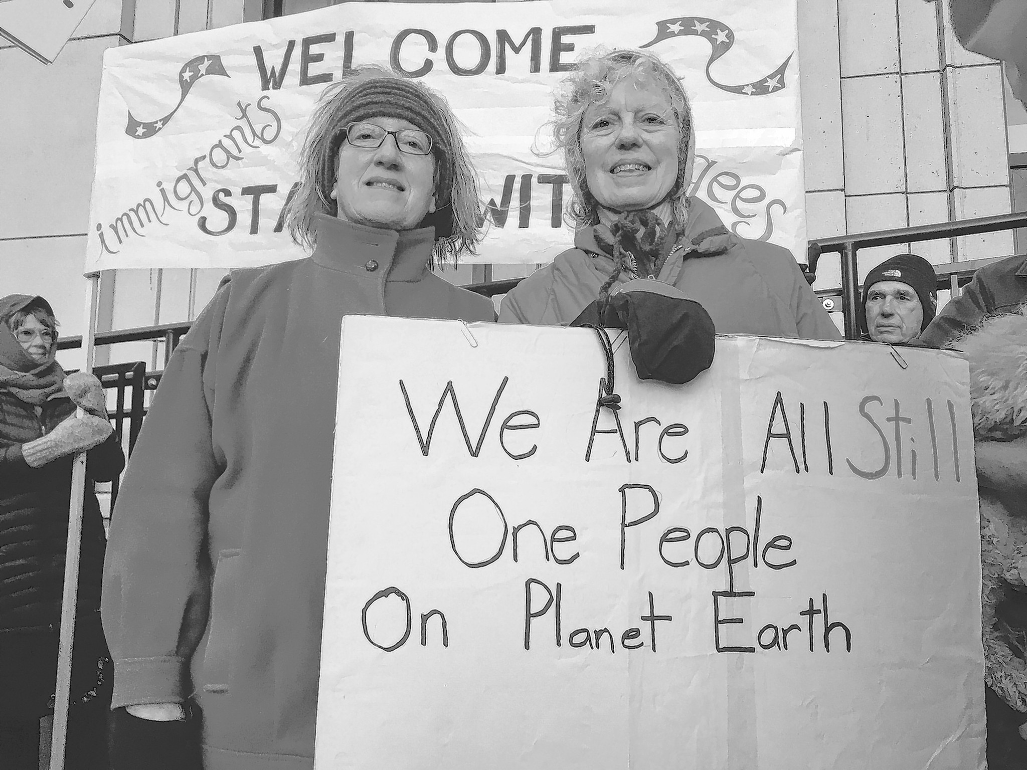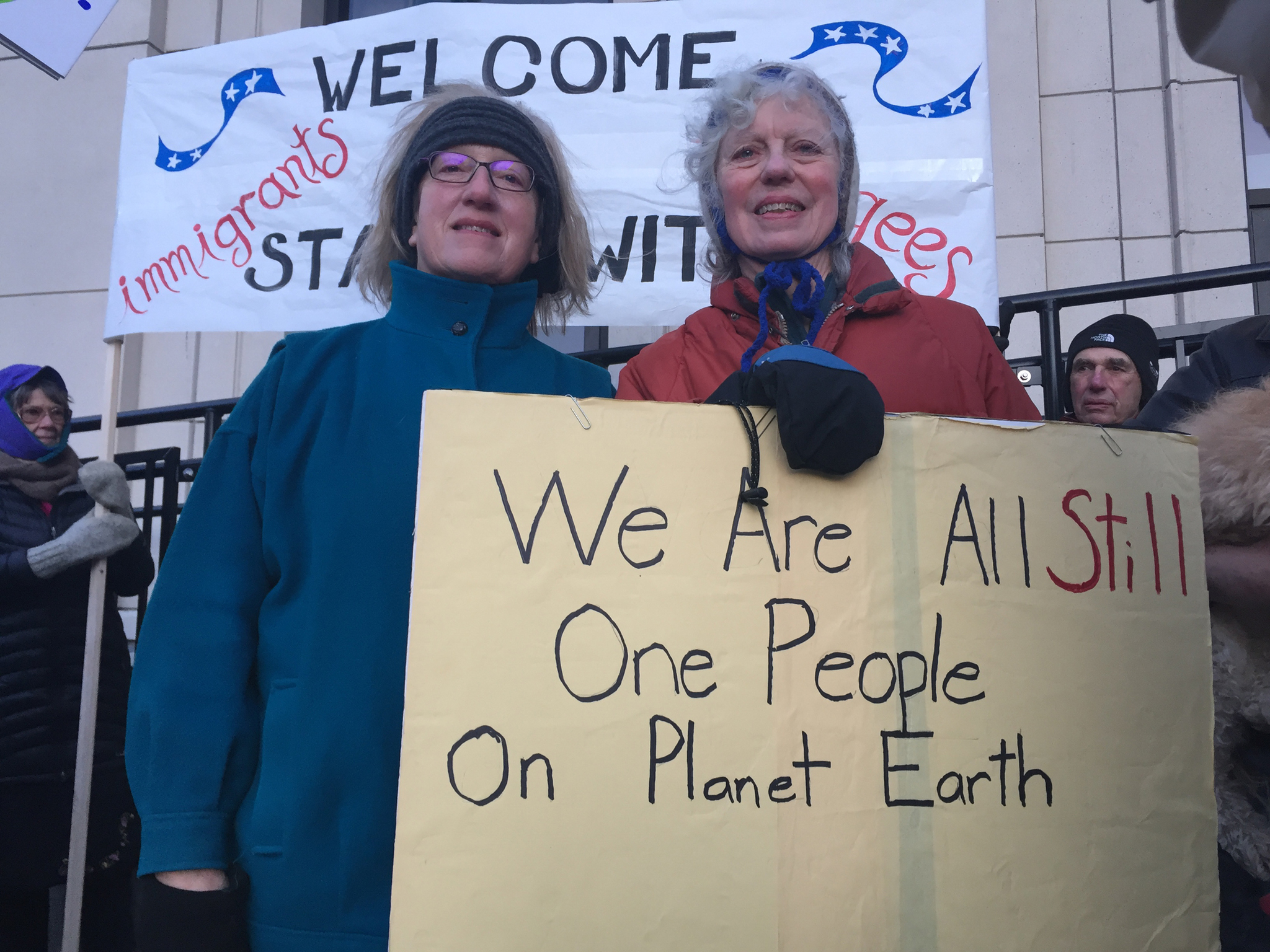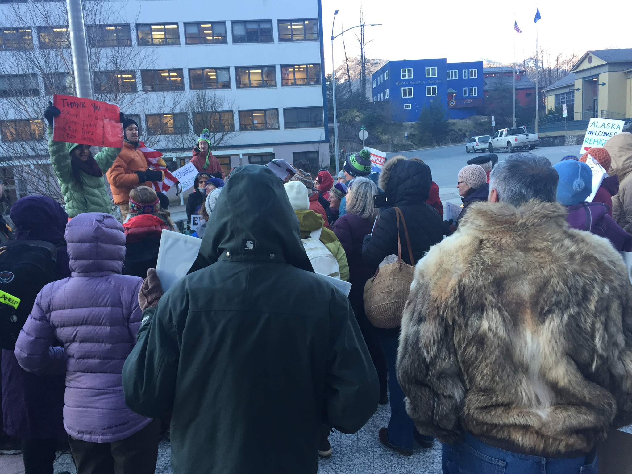 A panorama of the front of the Alaska Capitol shortly after 8 a.m. Monday shows several dozen people gathered to show support for refugees and immigrants. The first gathering, last week, attracted just fewer than 100 people. In an hour and a half, organizers collected 166 signatures asking Gov. Bill Walker to speak out against President Donald Trump’s executive order on immigration and refugees. (Mary Catharine Martin | Juneau Empire)