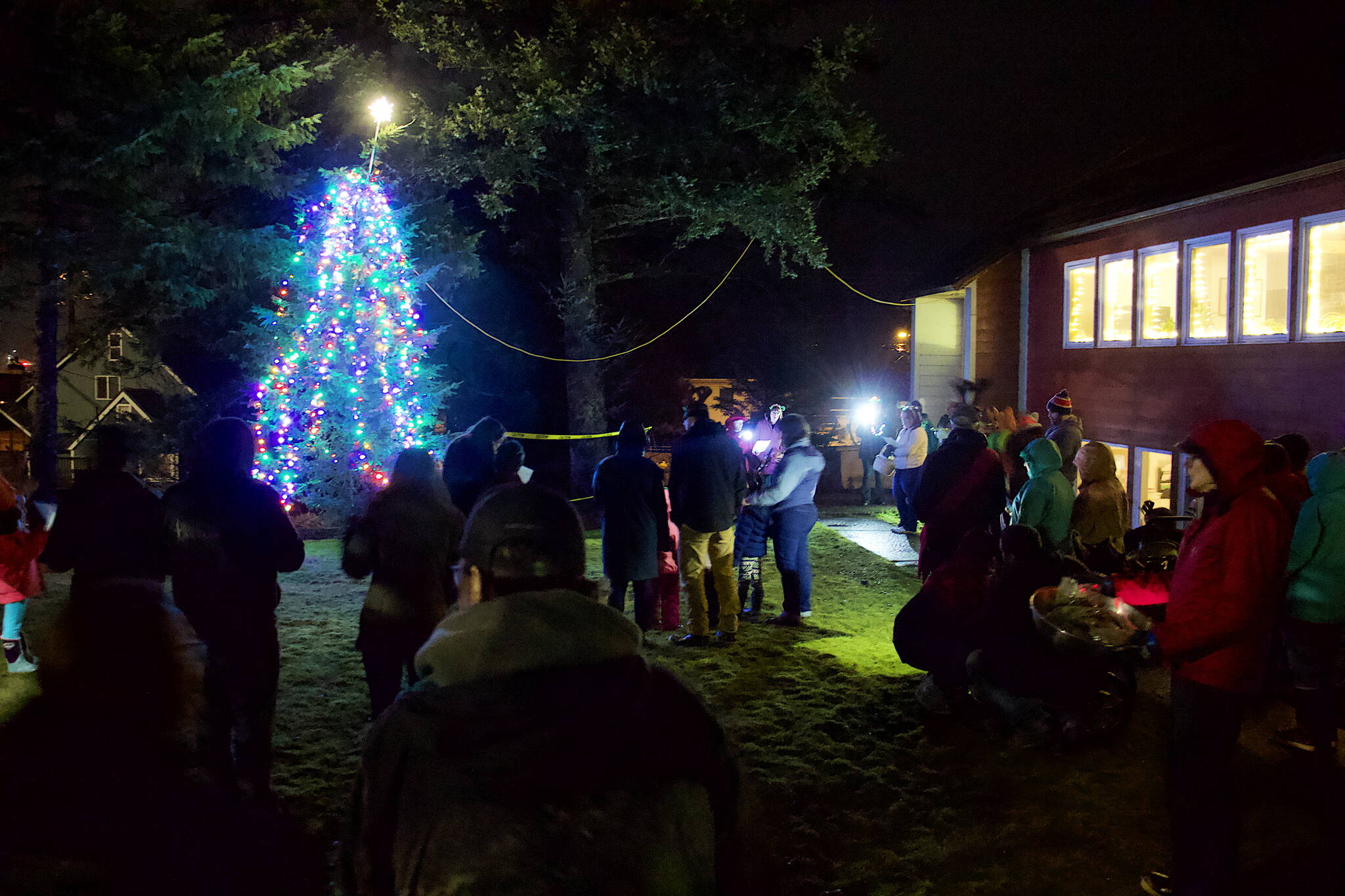 The lighting of the tree was performed by Ed Schoenfeld, a preeminent Douglas resident who was grand marshal of this year’s Douglas Fourth of July parade. He reminded those present that Douglas remains its own community, not “just a suburb of Juneau,” and at this time of year it’s good to remember the original town’s original Tlingit name of Anax̱ Ya Andagan Yé, meaning “where sunlight touches first.”