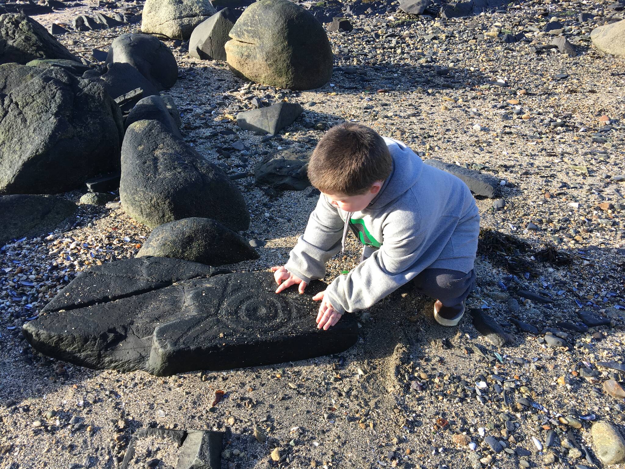 After they explore the tidepool, Jonah walks over to a glyph protruding out of the sand. He leans down and touches the petroglyph. He turns toward Jesse and says, “This is me.” Jesse and I glance at one another, and I shrug. Yes, it is him, I consider. You are these petroglyphs.