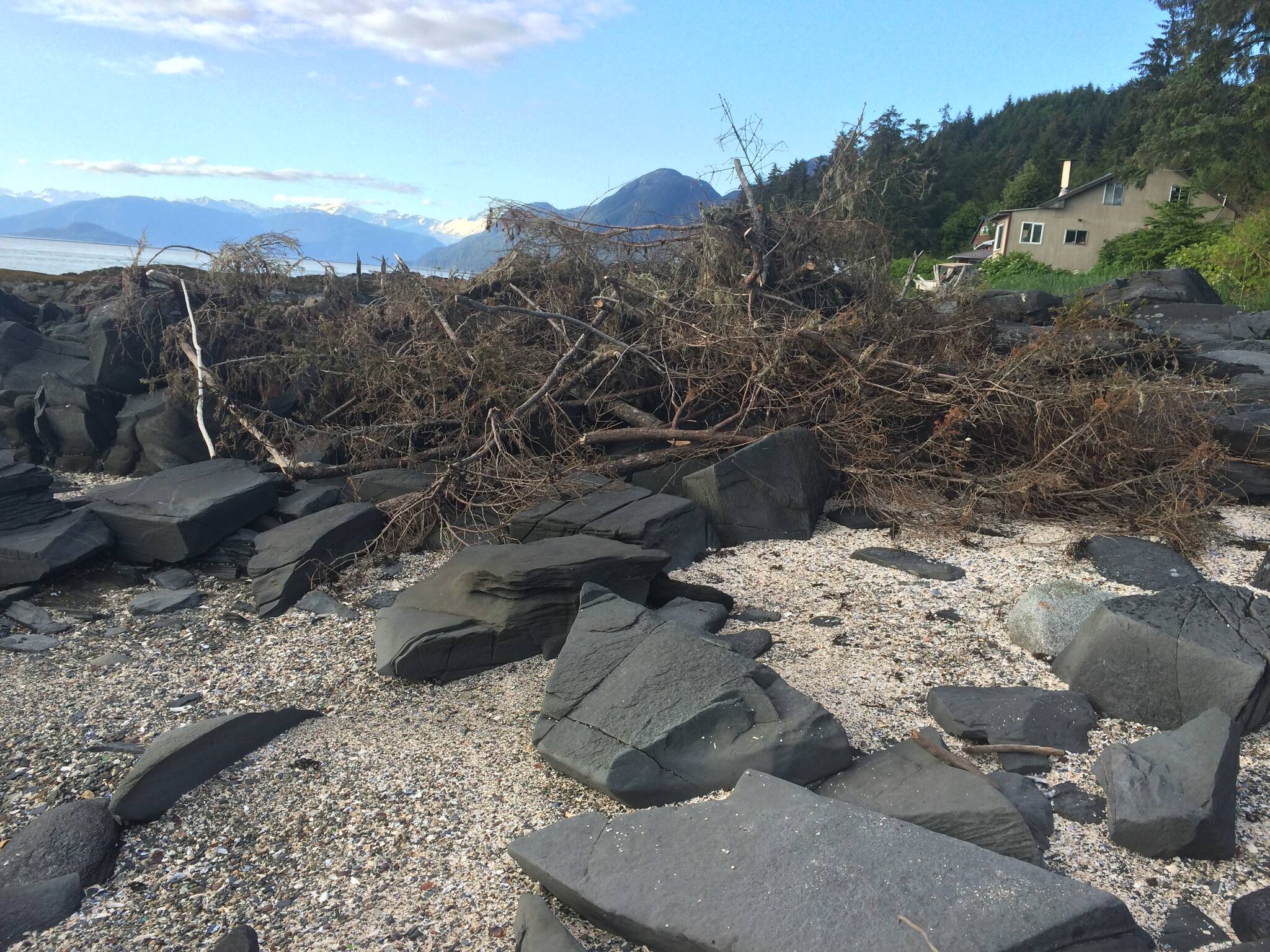 2016: My friend Kersten and I walk down the boardwalk to the beach below. We stroll along the first stretch of sand locating the glyphs, but as we head toward the rock ridge, we pause in disbelief. A large pile of tree branches, dirt, and roots covers my favorite spiral and face petroglyphs in front of the ridge. It appears the house next door has cut down spruce trees and the debris pile, a dump truck or two’s worth, piles high atop the glyphs. We spend the next hour dragging and heaving tree trunks and branches down closer to the tideline. We have no way to remove the dirt so we must rely on a higher tide to sweep it away.