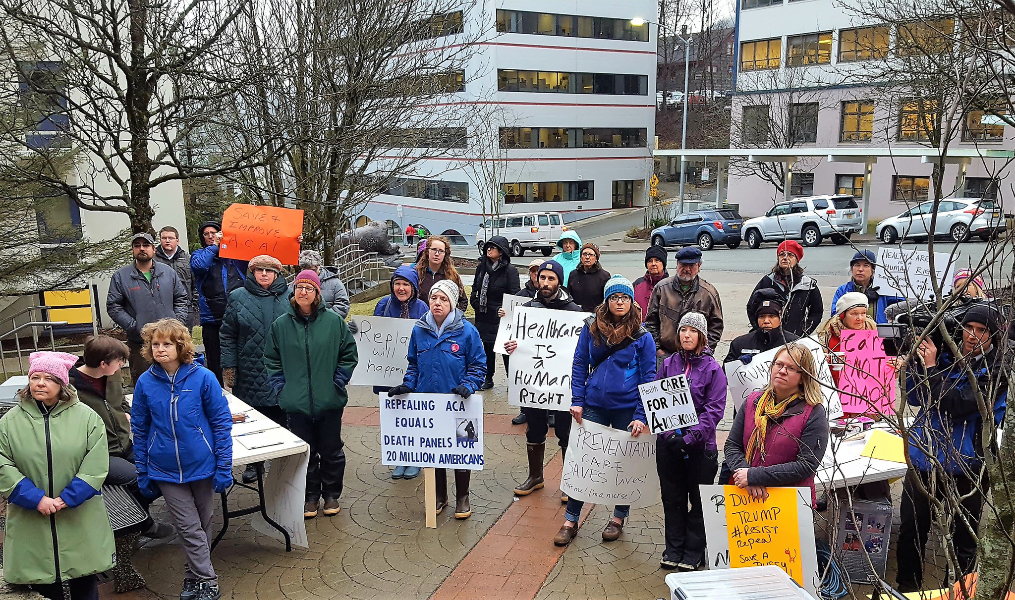 A little more than two dozen protesters gathered across from the Alaska State Capitol Thursday to call attention to the possible repeal of the Affordable Care Act and to urge state legislators to have a replacement plan in place.