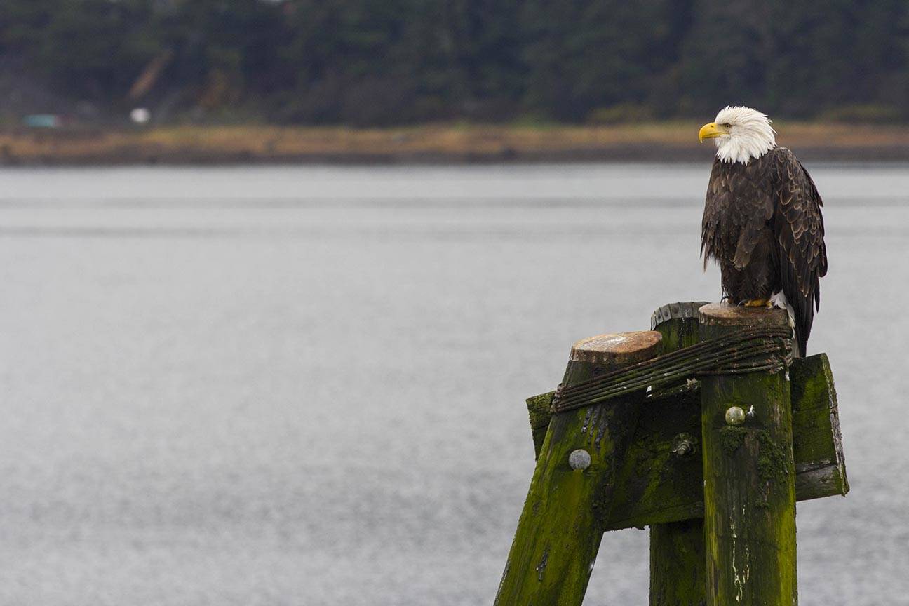 A bald eagle sits on a piling by the Macaulay Salmon Hatchery on Monday, Oct. 21, 2019. (Michael S. Lockett | Juneau Empire)