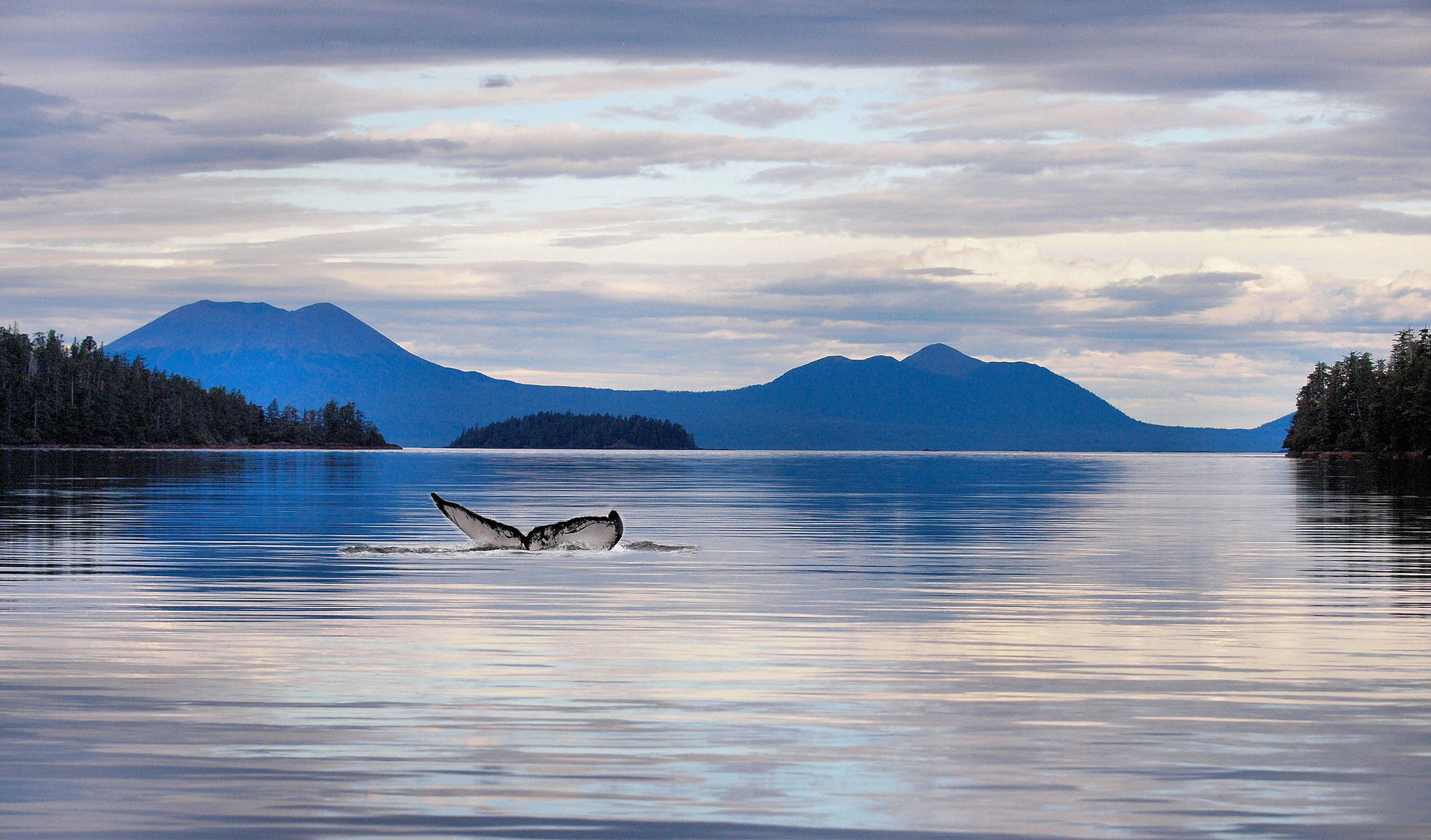 A humpback whale lifts its fluke out of the water in Sitka Sound with Mt. Edgecumbe in the background in August 2016. (Courtesy Photo | Charles Baxter)