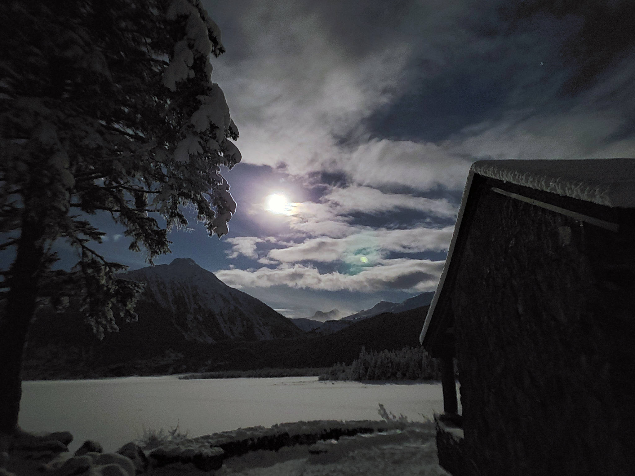 The full moon glows over the Mendenhall Visitor Center on Jan. 11, 2020. (Courtesy photo | Bryan Cormack)