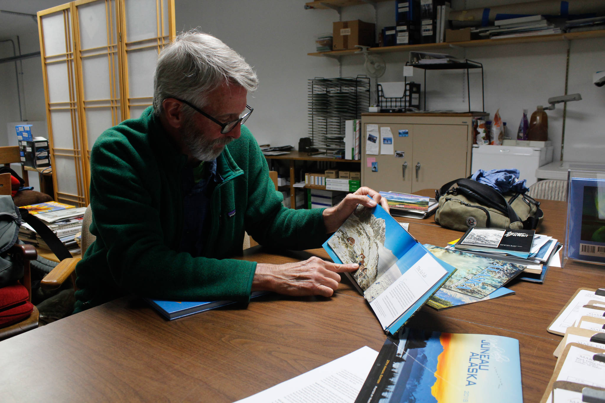 Once inside his studio, Kelley sat down and leafed through his 12th book of photos, “Alaska’s Mendenhall Glacier.” The photos inside it span five decades of his photography and even include historic photos that date back to 1894.