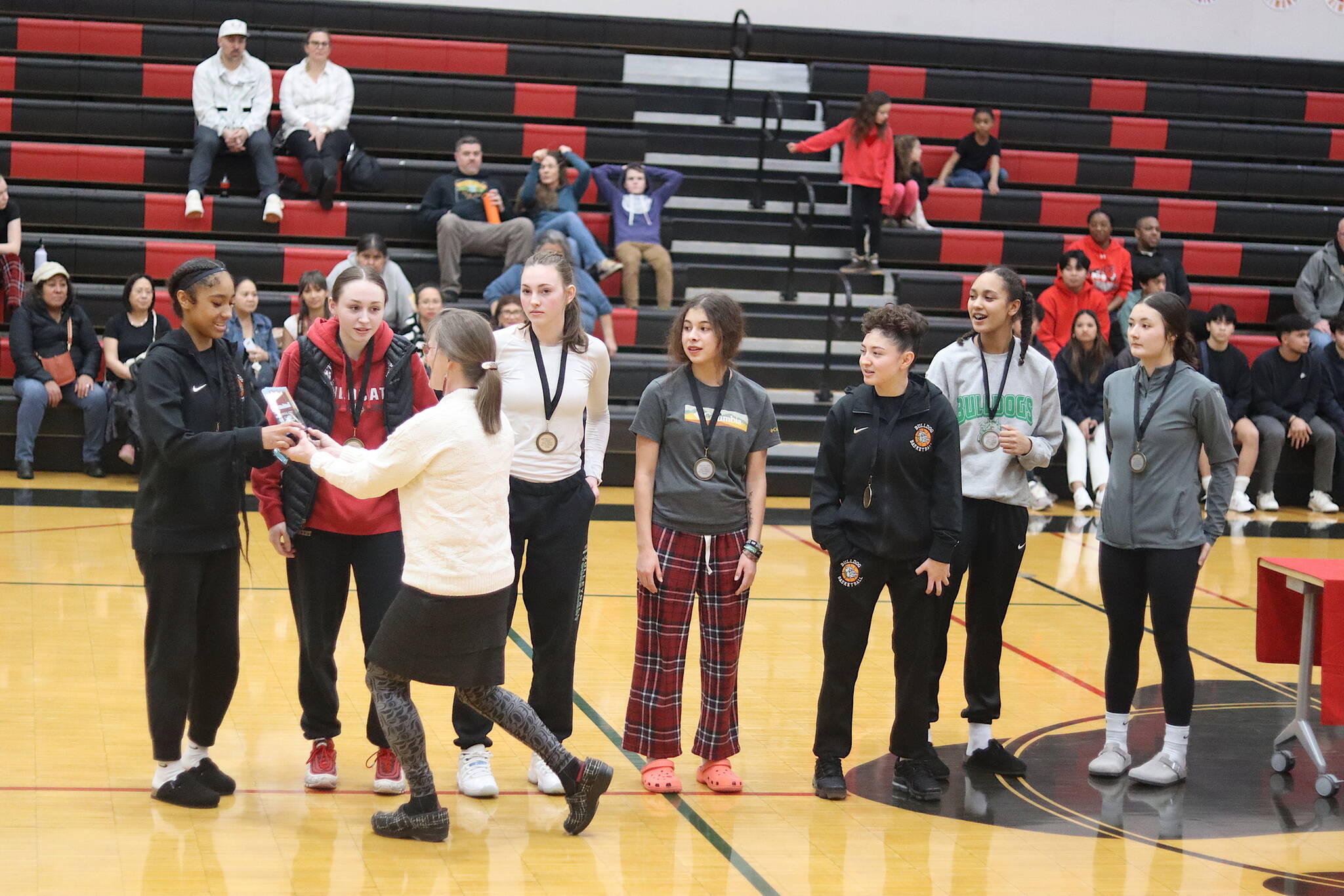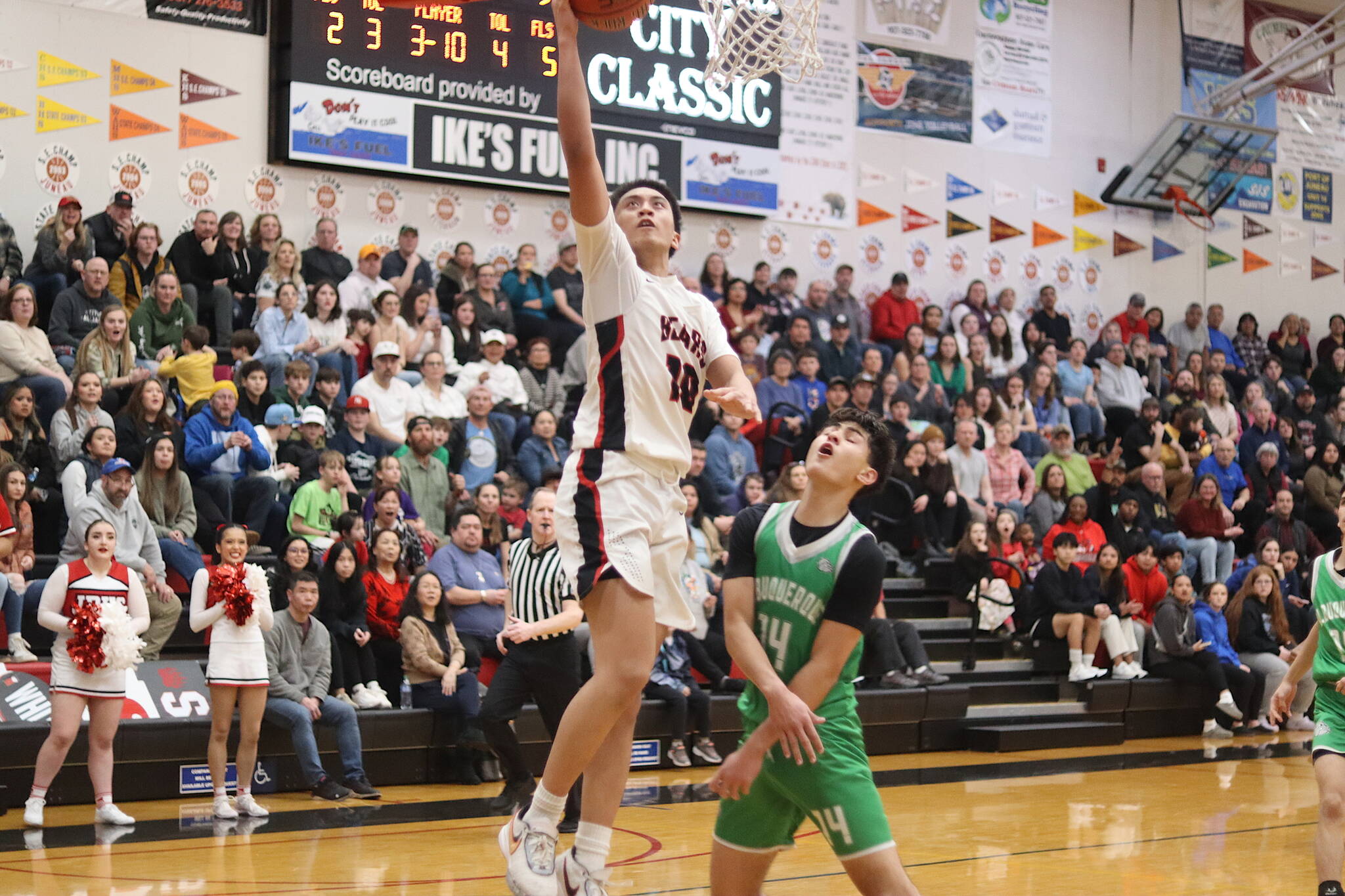 The loss by the Crimson Bears boys’ team followed a lopsided 63-32 defeat during its opening game against Washington’s Auburn Mountainview High School on Wednesday and a 64-57 victory against Eagle River High School on Thursday. The extended battle against the tournament champions in the finale was an indication of the progress the Crimson Bears are making early in the season, said Sean Oliver, a senior 6’4” guard who was honored during the post-tournament awards for scoring his 1,000th career point (which occurred in a game shortly before to the tournament).