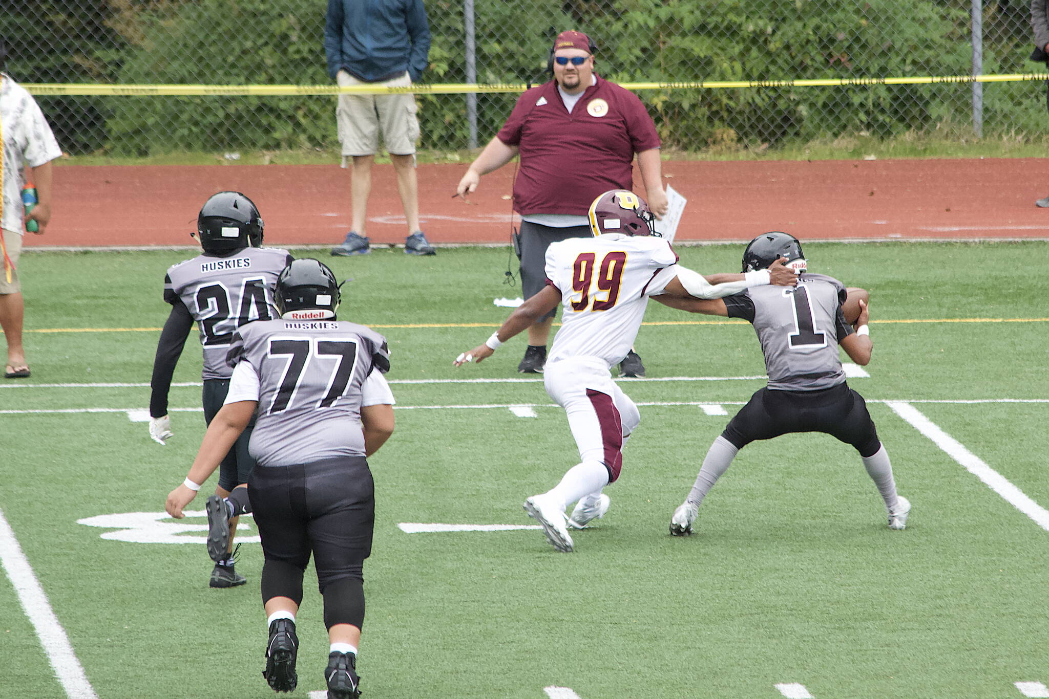 The Huskies were defeated 40-33 by the Dimond High School Lynx on Saturday at Adair-Kennedy Field in a game featuring huge momentum swings toward each team before a close battle in the final minutes. After Juneau fell behind 24-7 in the first half to a Dimond team able to sustain drives that capitalized on Juneau’s mistakes, the Huskies stormed back in the second half to take a 33-32 lead early in the fourth quarter with long scoring plays that took advantage of errors by the visiting team.
