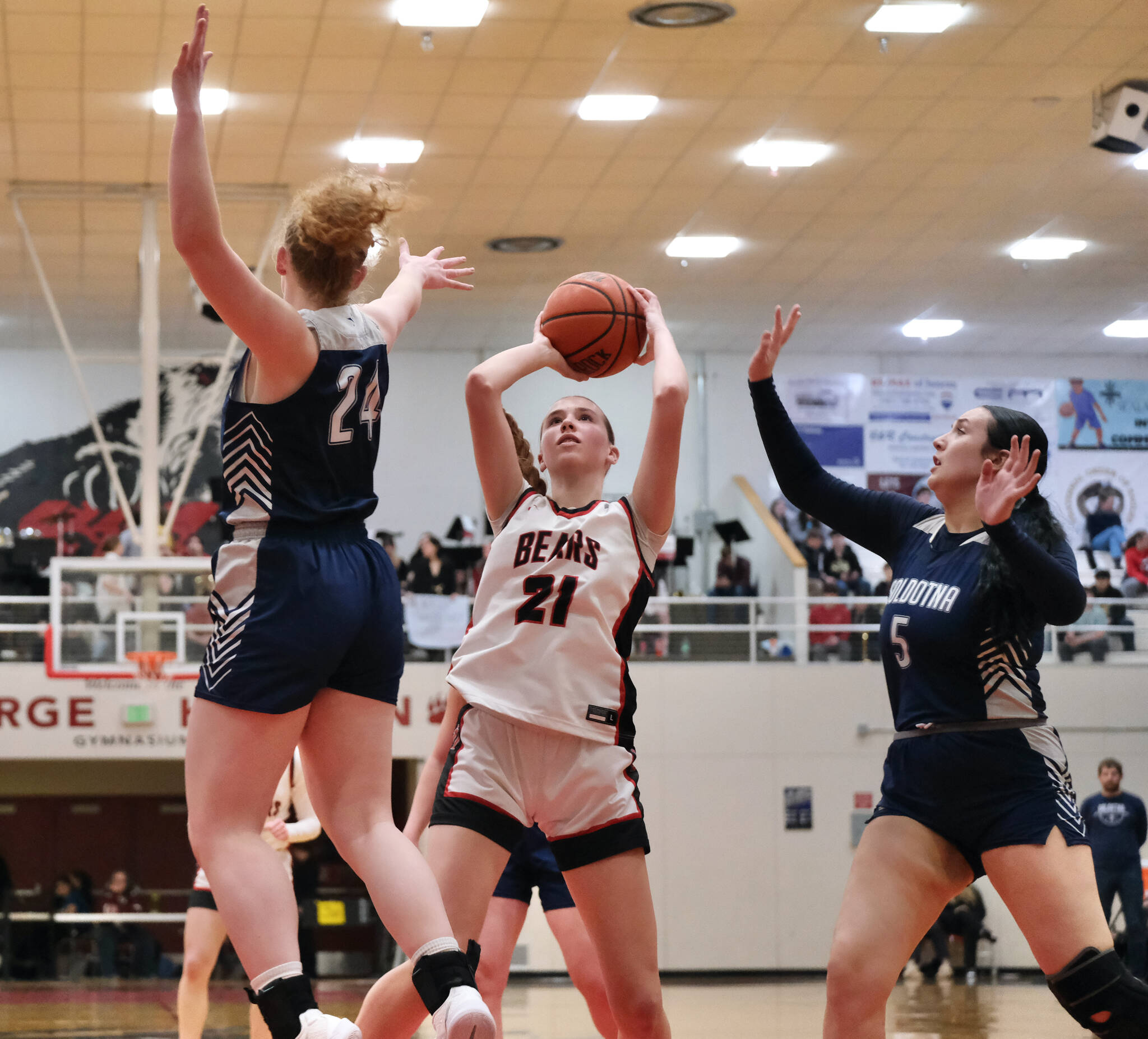 Soldotna senior Hope Hillyer responded with a couple trips to the free throw line and a tough shot inside as she tried to compete with the JDHS height.