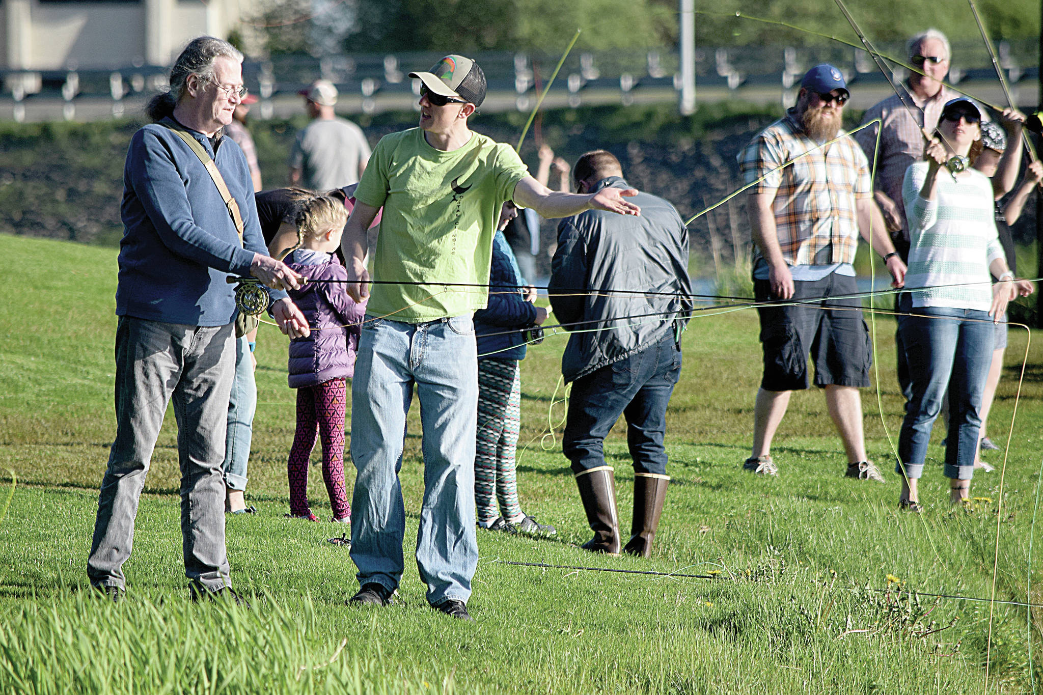 That accommodating spirit was alive and well during the annual Fly Casting Night on a warm Wednesday evening at Twin Lakes. Over 100 fishermen — some with personal rods and others with loaned rods — lined the grassy shores to practice their casts. Alaska Fly Fishing Goods partners with local organizations Rain Country Fly Fishers and Tongass Trout Unlimited Chapter to put on the lessons every spring.