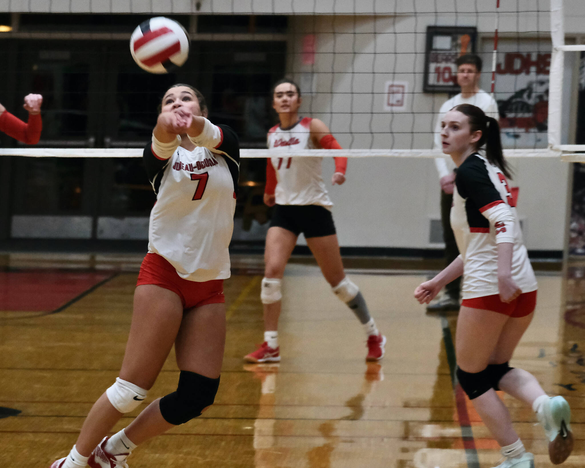 “I’m really proud of our girls,” JDHS coach Jody Levernier said. “I think they put up a good fight. Wasilla is a really good team. For tomorrow, we need to cover our hitters for when they block us and pass the ball a little bit better. But I was impressed with our girls and how they didn’t give up and kept on fighting. We came in a little bit intimidated and we changed that to being aggressive and I thought they did great.”
