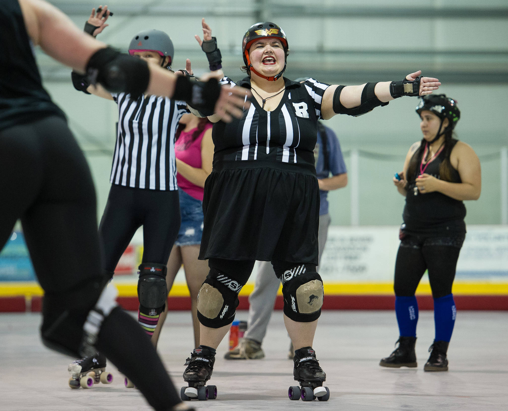 Other players have much more experience, including Catapult Kim and Just Julie, who joined the league in its first months back in 2010. Plus Catapult Kim grew up in a skating rink, she said. Her mom skated. She started young, even worked at a rink. And players such as Destroyevsky and Killstoy have skated six years, off and on and in different locations. They had started competing with the same league as Cap’n Tate (Tripp Crouse), officiating a game in Juneau for the first time, along with another official who found his way to Juneau.