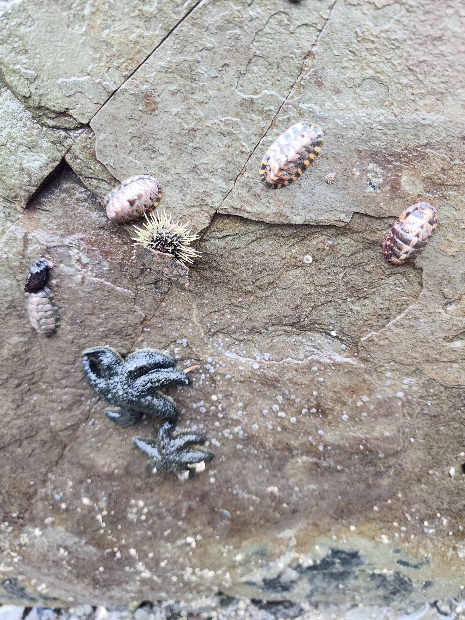 Under other rocks, we found several tiny hermit crabs in their periwinkle shells. Very dirty shells, they were, covered with debris and silt. On the underside of several rocks were small sea stars, some with five arms and some with six. Pretty little lined chitons clung there too, but only on two of the overturned rocks.