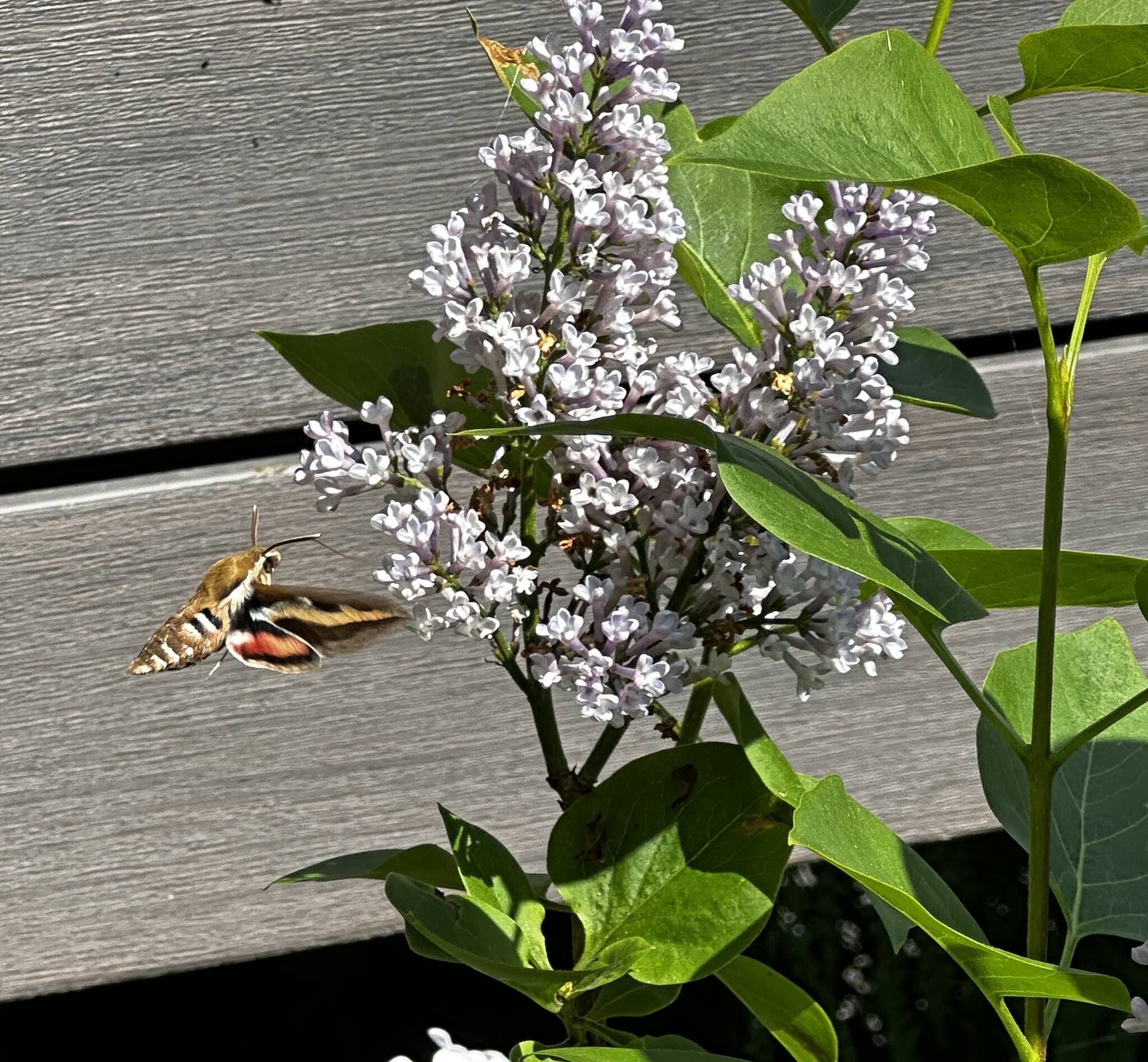 Sometimes there is good fun right outside one’s doorstep. A friend sent this photo of a beautiful hawk moth visiting a flowering lilac bush. It’s the bedstraw hawk moth (Hyles gallii), which ranges over the northern hemisphere. The larvae feed on fireweed, bedstraw, and many other plants. Several species of hawk moth are important pollinators of orchids and other flowers, hovering in front of the flowers and inserting a long tongue for nectar, while incidentally (to the moth) picking up pollen that can be transferred to another flower.