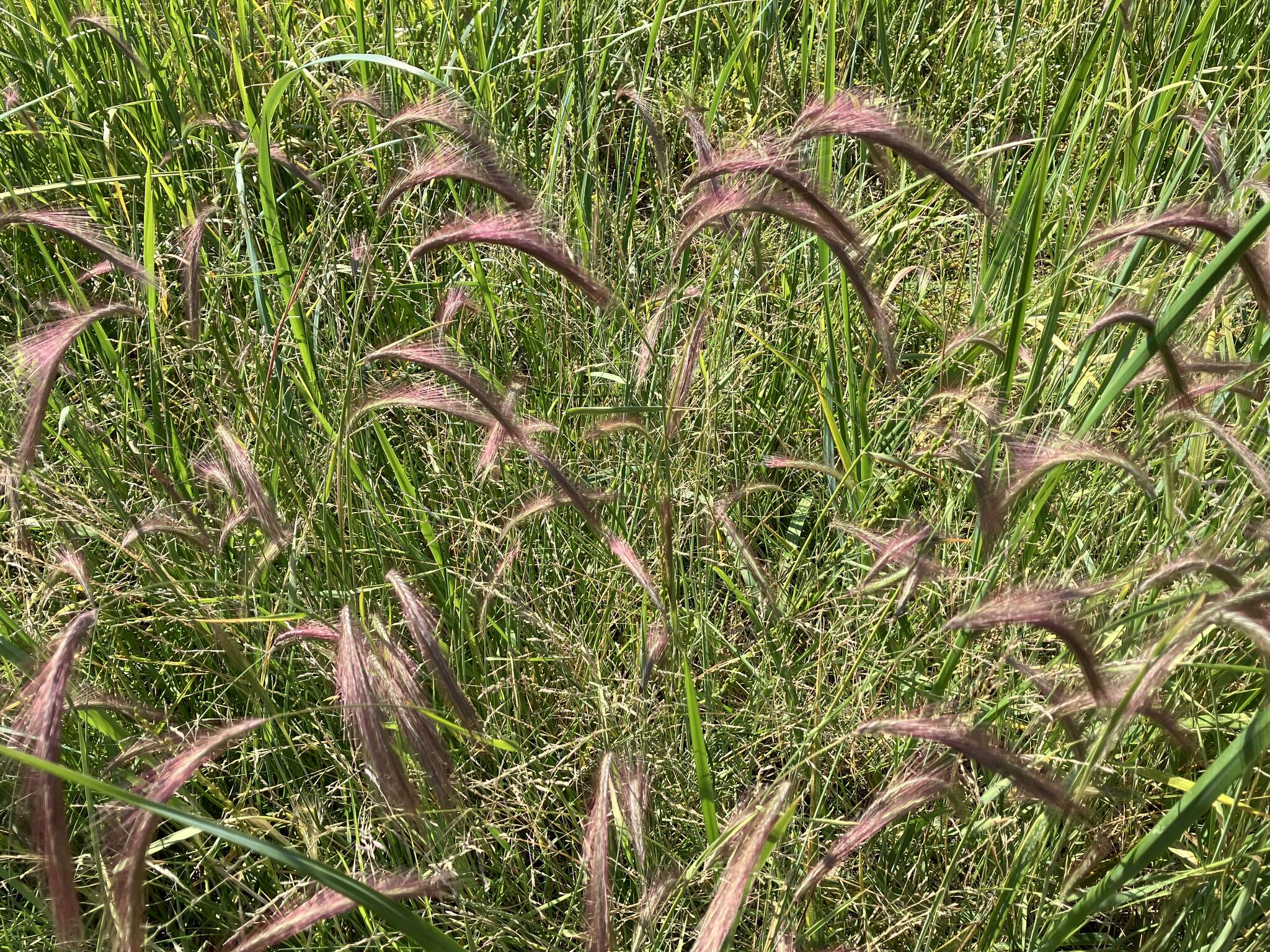 However, the plant kingdom was not to be out-done. In the big meadow, great stands of meadow barley delighted our eyes. The gracefully curved flowering heads swayed gently in the breeze, gleaming a muted reddish-gold in the sun. The meadow rippled with color. This native perennial grass grows in wet places in western North America, including southern Alaska; some populations are more tolerant of salinity than others. The flowering spike is narrow, and bracts around each floret bear rather long bristles (called awns).