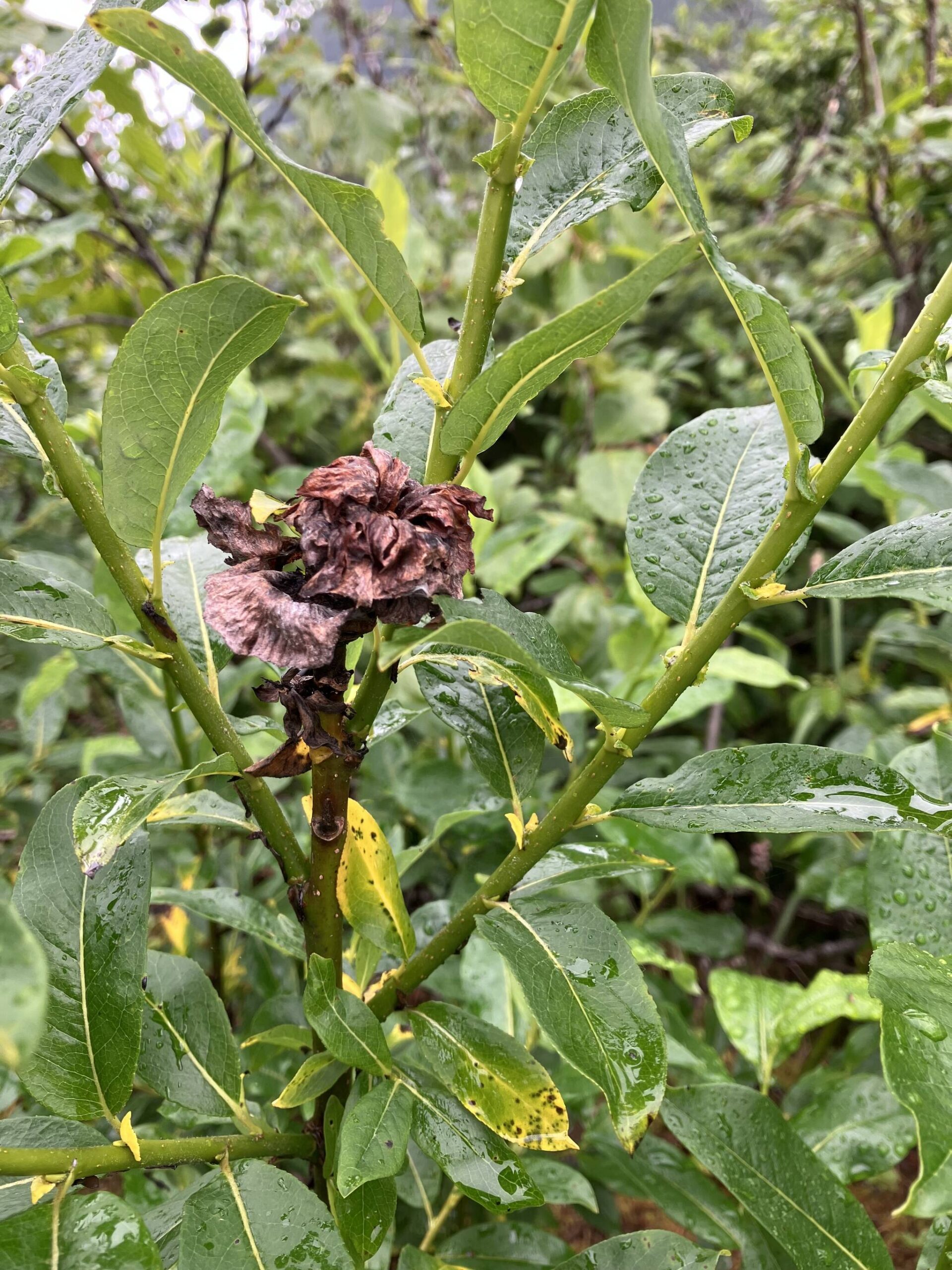 Along the way, we found some nice examples of last year’s willow roses. A midge lays its eggs in the tip of a shoot, the midge larva stunts the shoot growth while it eats the tissues, and eventually kills the shoot. But the willow branch isn’t done! Subsidiary branches below the dead shoot sprout exuberant new growth the next year.