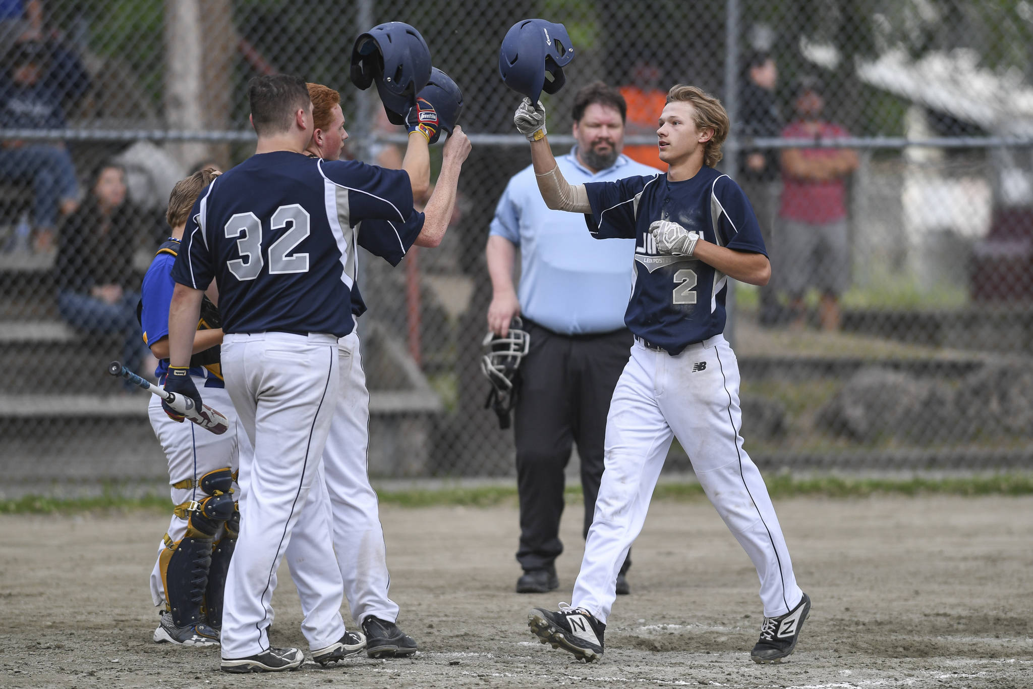 Juneau’s Gabe Storie, right, touches helmets with teammate Robert Cox and Luke Mallinger after hitting a two run homer in the fourth inning against Bartlett in Legion League baseball at Adair-Kennedy Memorial Park on Friday, June 21, 2019. (Michael Penn | Juneau Empire)