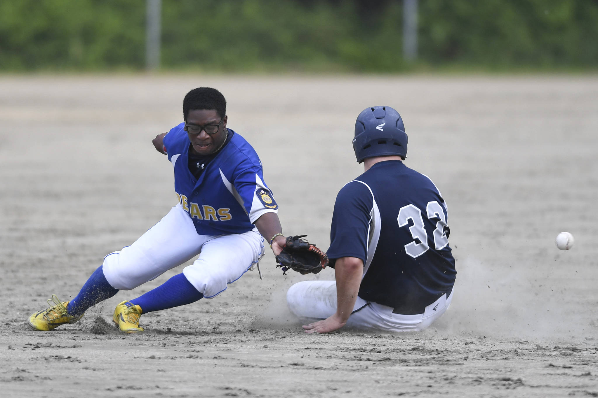 Juneau’s Robert Cox, right, steal second against Bartlett’s Ian Byrd in the fourth inning in Legion League baseball at Adair-Kennedy Memorial Park on Friday, June 21, 2019. (Michael Penn | Juneau Empire)