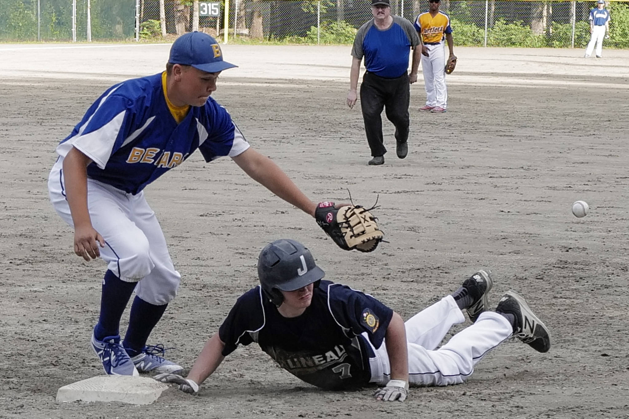 Juneau’s Oliver Mendoza beats the throw to Bartlett’s Eli Corwin in the first inning in Legion League baseball at Adair-Kennedy Memorial Park on Friday, June 21, 2019. (Michael Penn | Juneau Empire)
