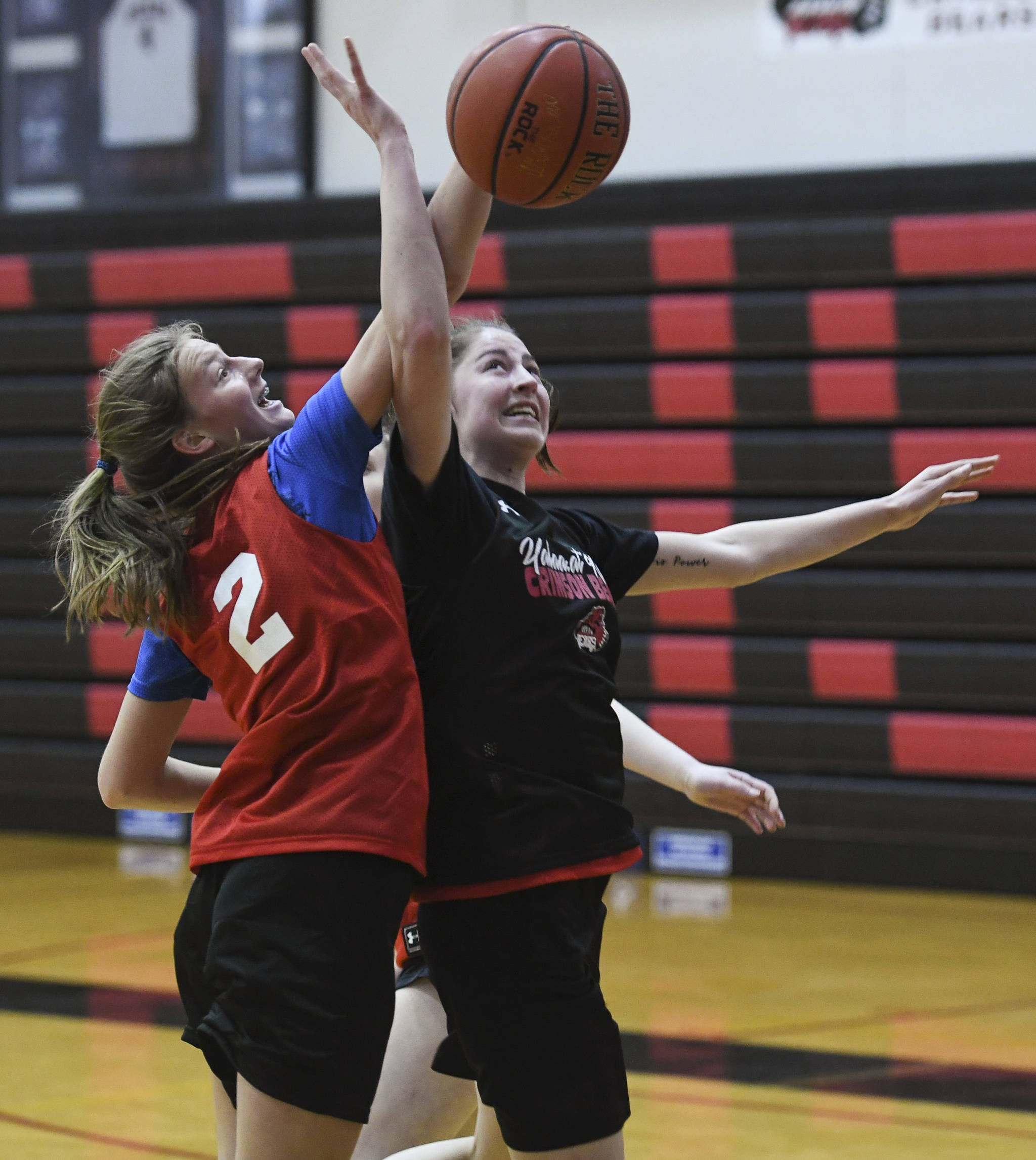 Skylar Tuckwood, left, blocks a shot by Kendyl Carson during girls varsity basketball practice at Juneau-Douglas High School: Yadaa.at Kalé on Monday, Dec. 9, 2019. (Michael Penn | Juneau Empire)