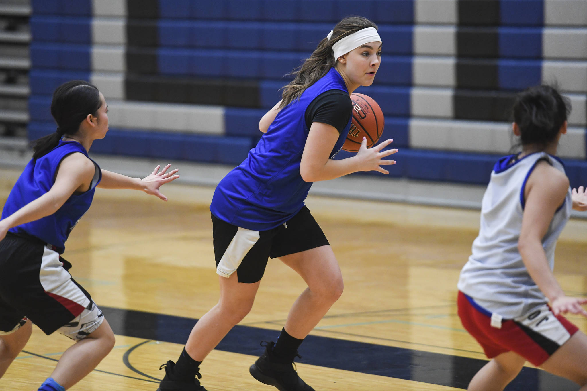 Kendyl Carson, center, looks to pass against Skylar Tuckwood, right, during girls varsity basketball practice at Juneau-Douglas High School: Yadaa.at Kalé on Monday, Dec. 9, 2019. (Michael Penn | Juneau Empire)