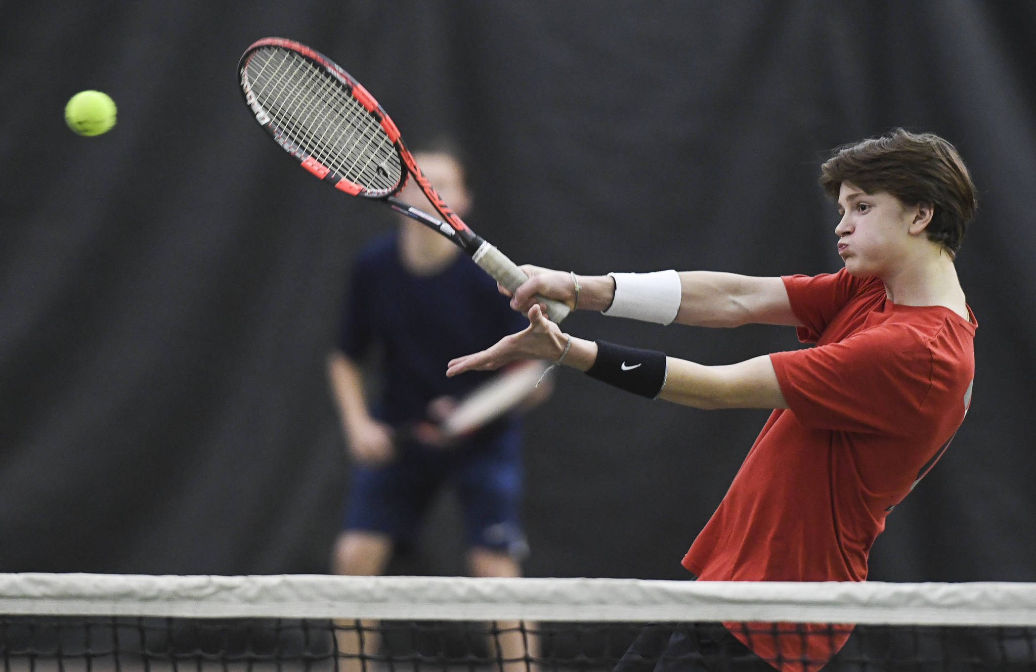 Kevin Kooistra returns a forehand as he plays doubles with partner Alain Soltys-Gray as they play against Liam Penn and Callan Smith at the Region V Tennis Tournament at the Alaska Club/JRC on Wednesday, Sept. 25, 2019. Penn and Smith won the match 6-2, 6-1, and played Will Rehfeldt and William Smoker in the final on Saturday. (Michael Penn | Juneau Empire)