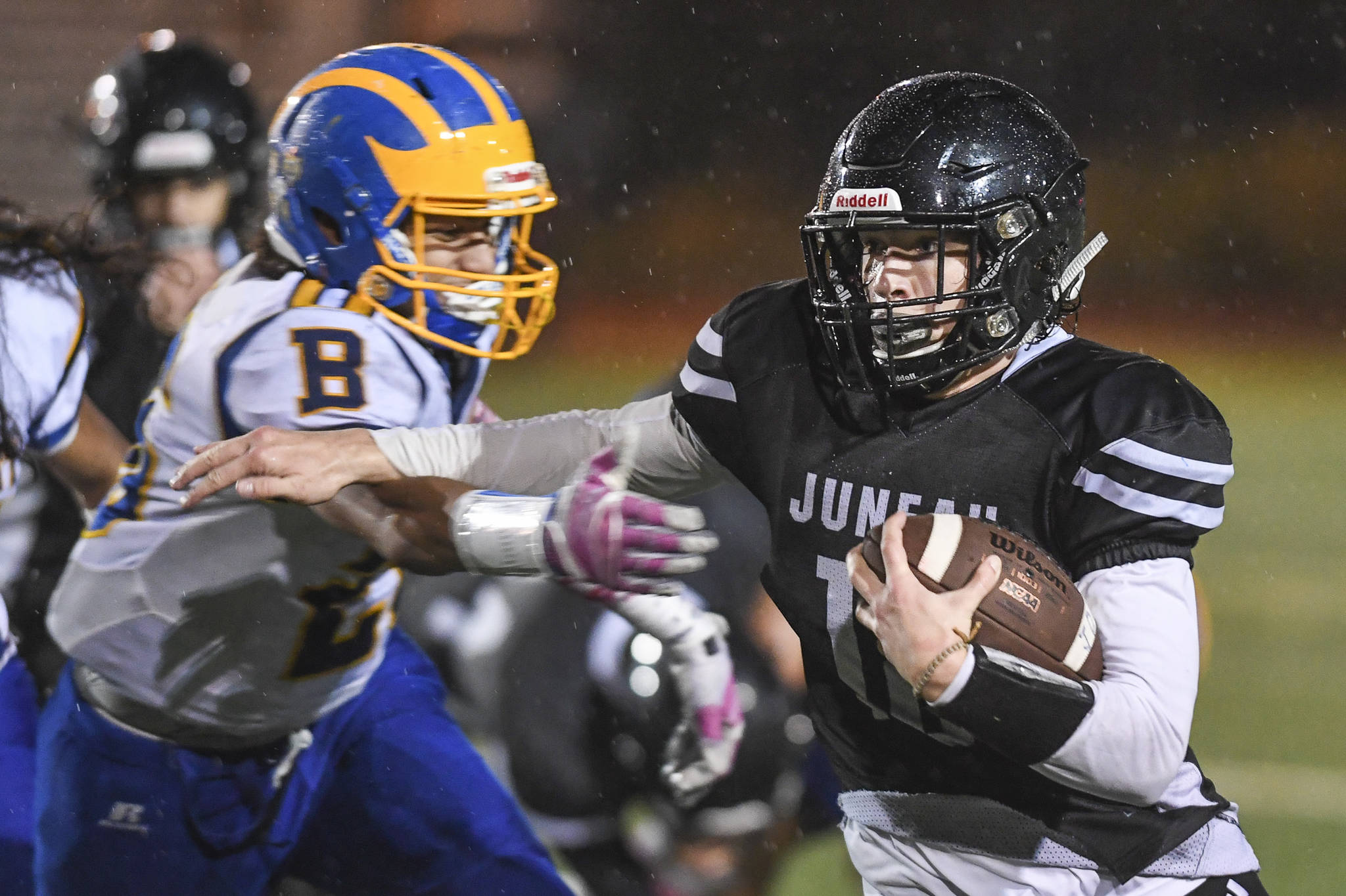Juneau’s Cooper Kriegmont is tackled by Bartlett’s Tairel Tili at Adair-Kennedy Memorial Field on Saturday, Oct. 5, 2019. Juneau won 67-24. (Michael Penn | Juneau Empire)