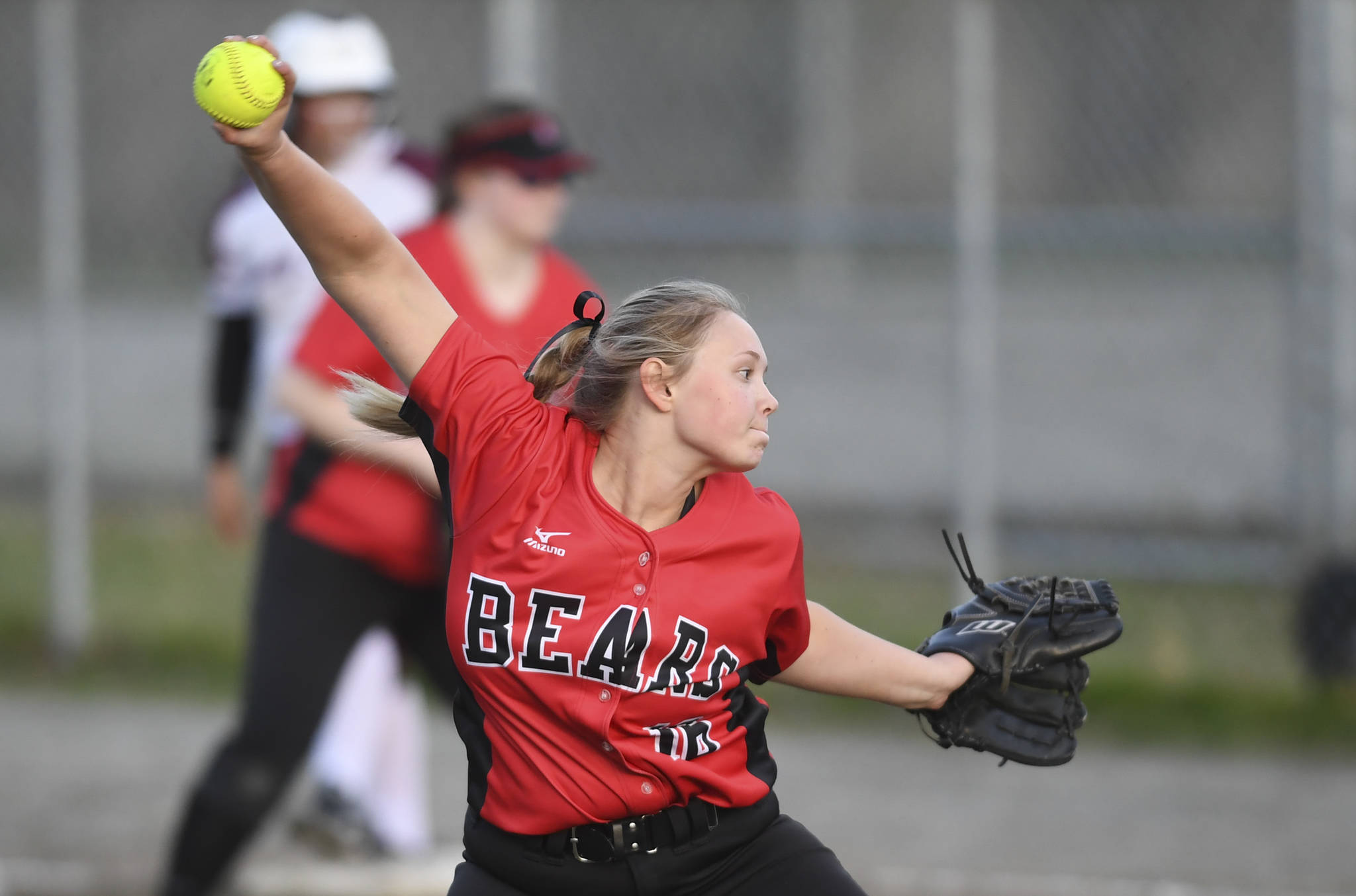 Juneau-Douglas’ Sophia Schauwecker pitches against Ketchikan in the four inning at Melvin Park on Thursday, May 9, 2019. Ketchikan won 13-0. (Michael Penn | Juneau Empire)