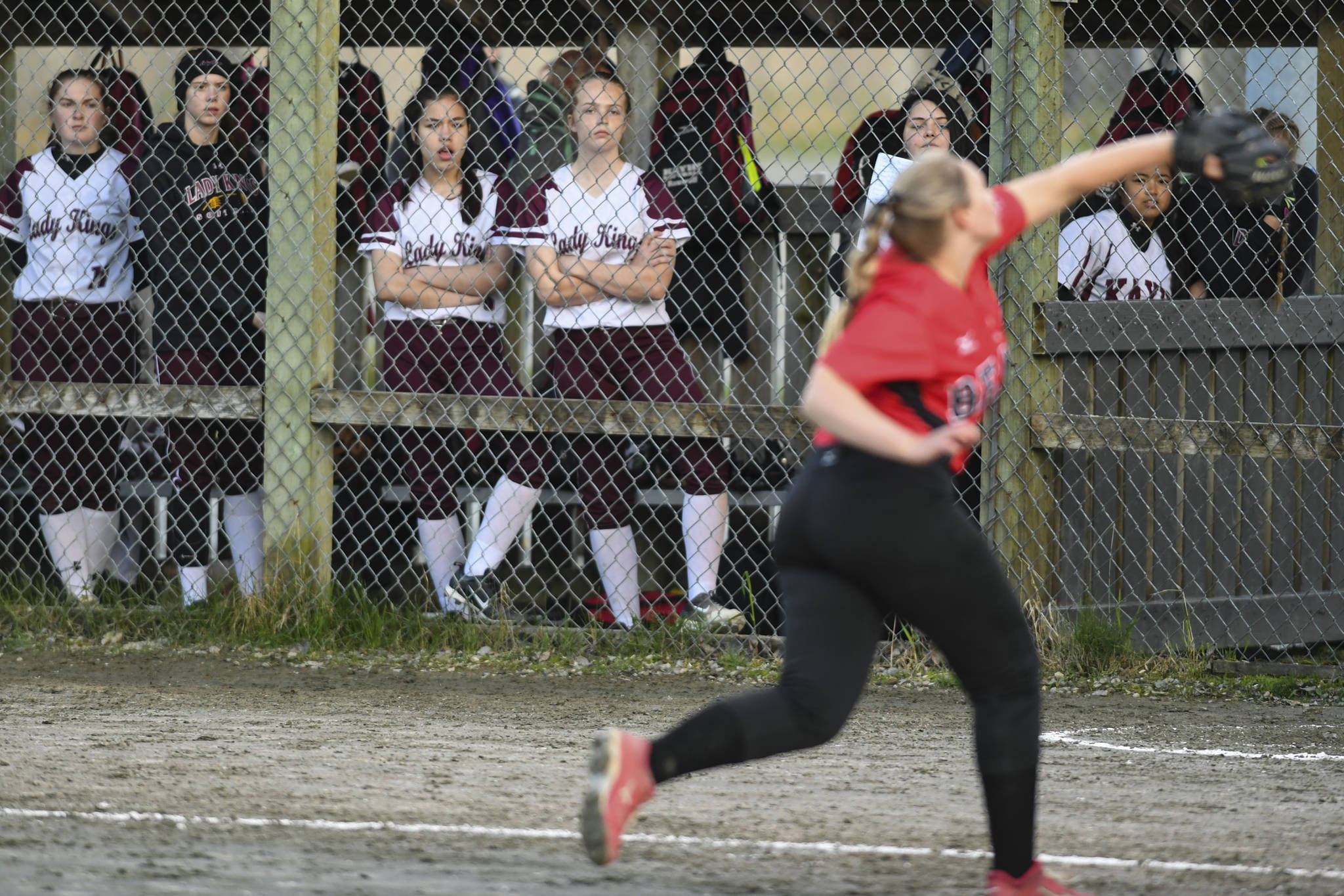 Ketchkian players watch as Juneau-Douglas’s Sophia Schauwecker catches an infield pop up in the four inning at Melvin Park on Thursday, May 9, 2019. Ketchikan won 13-0. (Michael Penn | Juneau Empire)