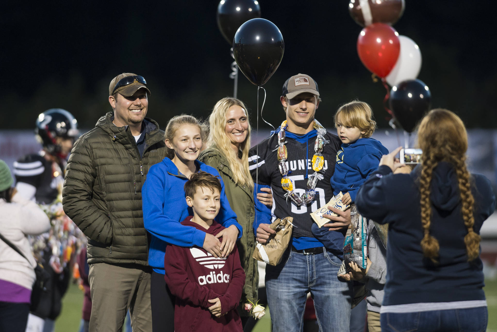 Family and friends celebrate senior Puna Toutaiolepo before Juneau United’s game against Colony at Thunder Mountain High School on Friday, Sept. 21, 2018. (Michael Penn | Juneau Empire)