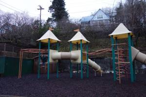 A child plays at Capital School Park. The park is in line for a remodel that will fix the crumbling retaining wall, visible in the background. (Dana Zigmund / Juneau Empire)