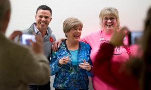 Norton Gregory, left, Mary Becker, center, and Beth Weldon pose for pictures in the Assembly chambers after winning their respective Assembly seats in the municipal election on Oct. 4, 2016. (Michael Penn | Juneau Empire)