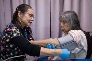 Mynita Gonzales, right, has her blood pressure, blood sugar and cholesterol checked by Laura Stats, of Bartlett Regional Hospital, during the Juneau Coalition on Housing & Homelessness’ Project Homeless Connect in the Juneau Arts & Culture Center on Wednesday, Jan. 25, 2017. (Michael Penn | Juneau Empire)