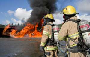 Capital City Fire/Rescue firefighters Cheyenne Sanchez, left, and Andrew Wheeler man a safety hose as they watch a…