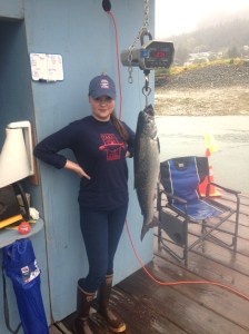 Katherine Dimond, 23, stands beside her winning 27.4 pound catch on Friday at the Douglas weighing station. Dimond's catch was the largest during the three-day 2016 Golden North Salmon Derby.